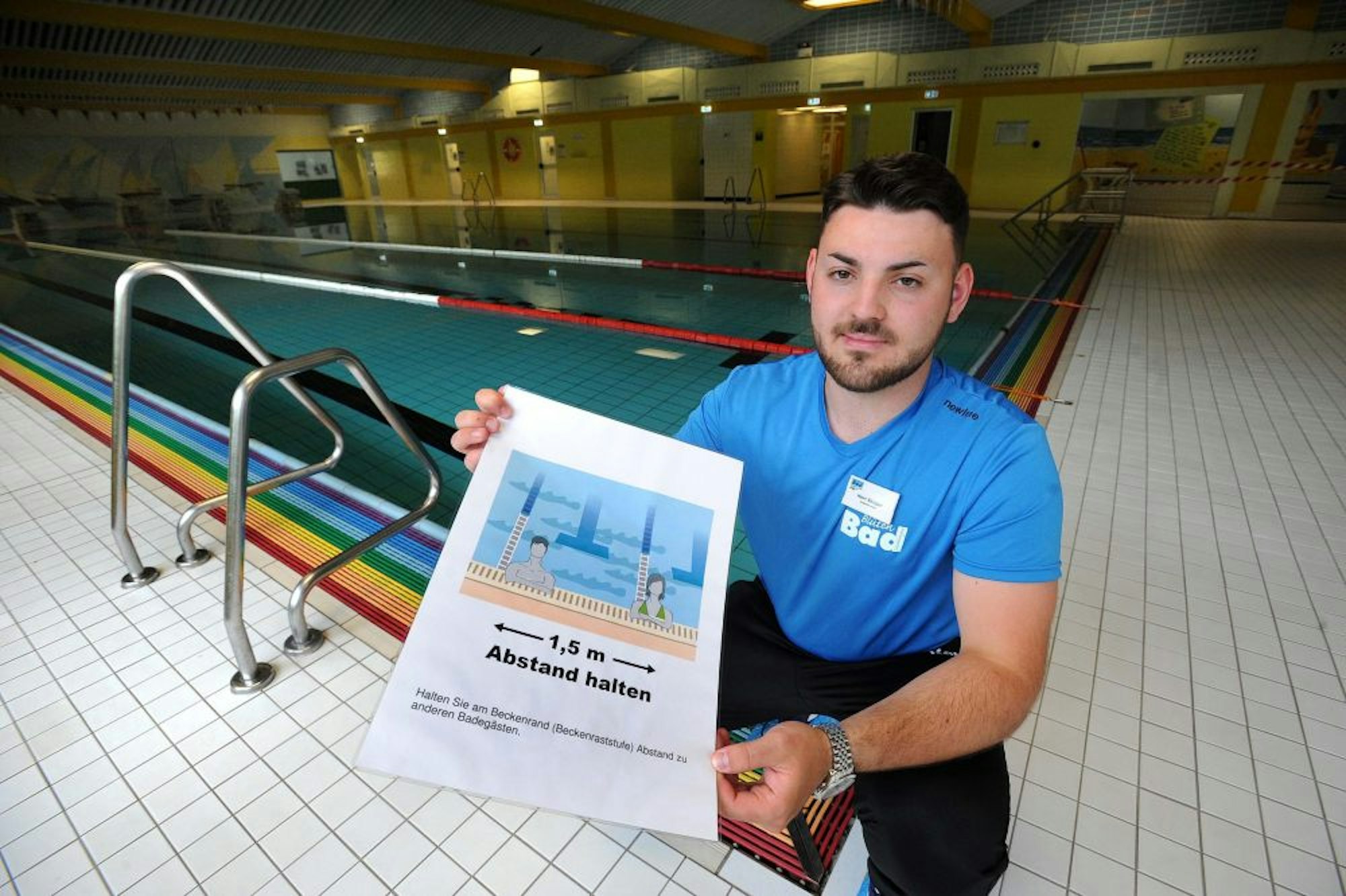 Auch im Becken gilt der Sicherheitsabstand, sonst pfeifen Azubi Max Sänger und seine Kollegen vom Blütenbad die Schwimmer zurück.
