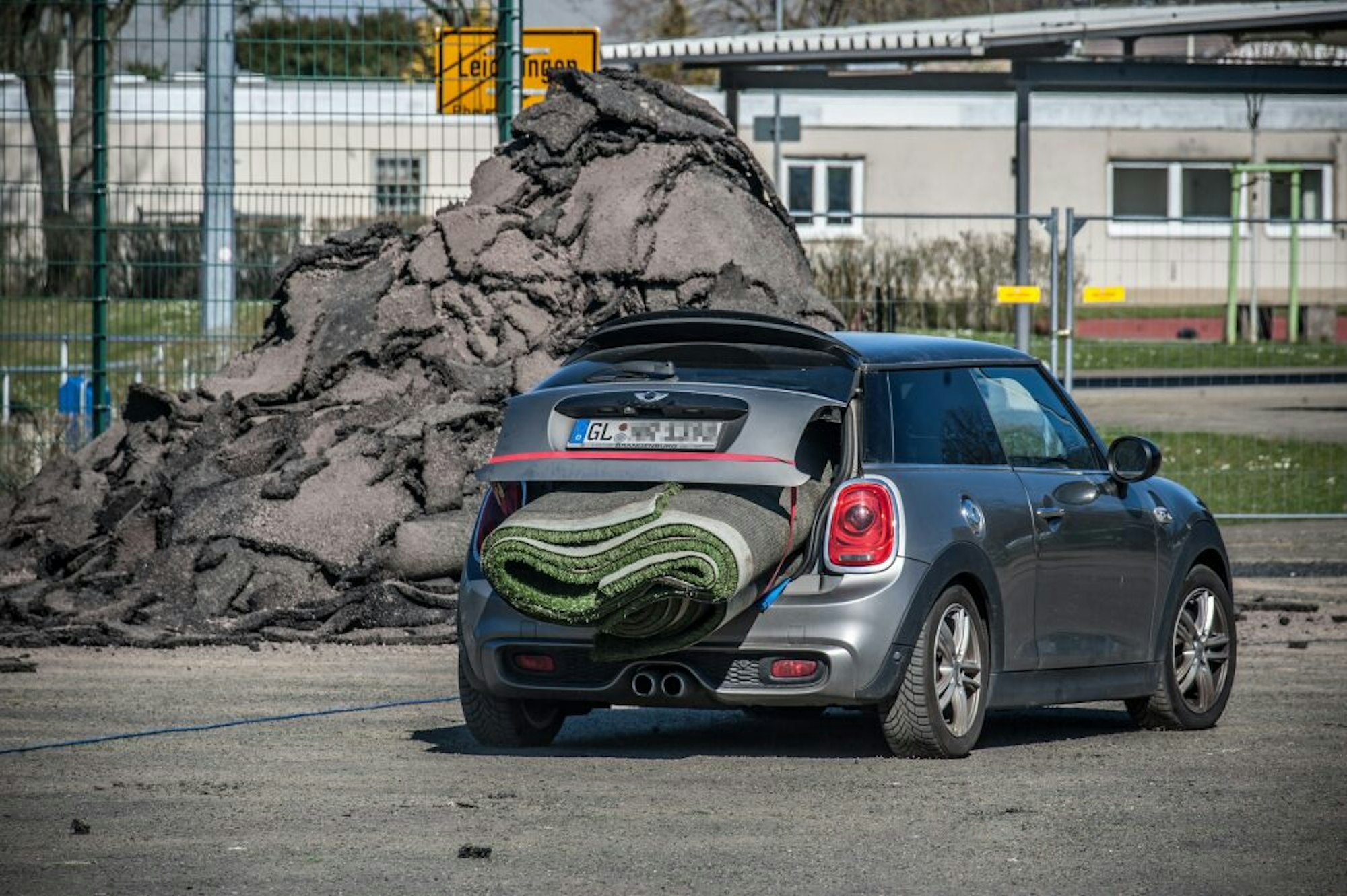 Selbst in einem Mini wurde der Leichlinger Kunstrasen zu einer neuen Verwendung abtransportiert.
