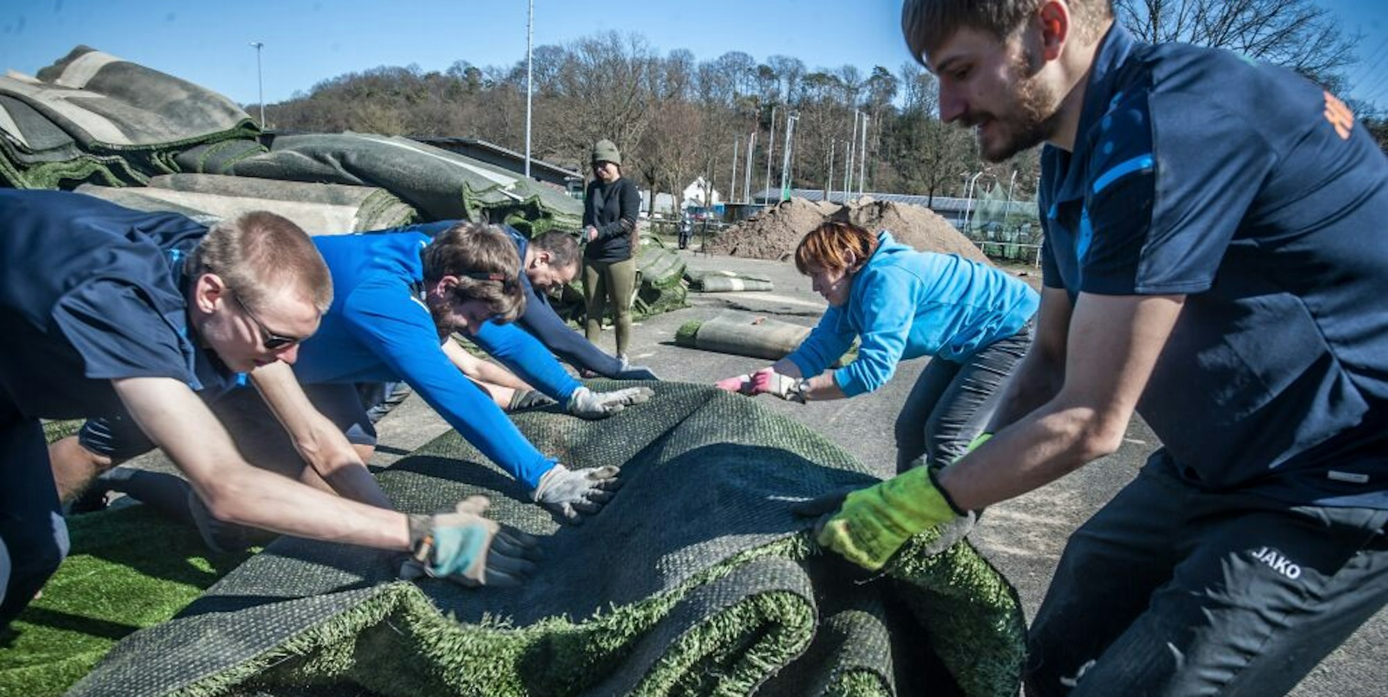 Kraftakt: Hand anlegen für die Vereinskasse, hieß es für die Aktiven beim SC-Leichlingen. Viele Quadratmeter Kunstrasen mussten mühsam bewegt werden.