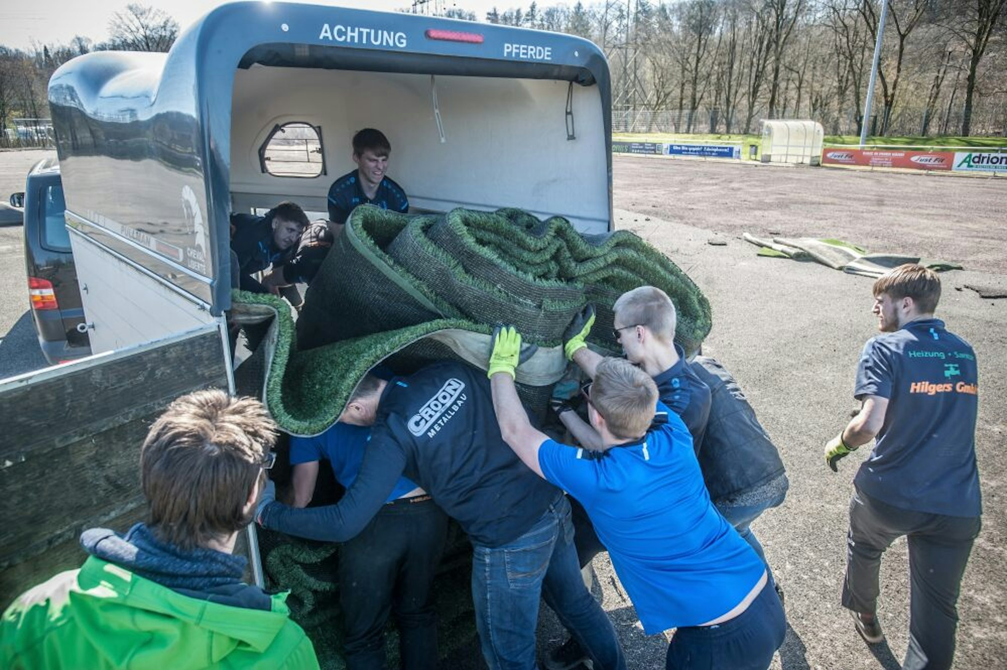 Manchmal war eine Extraportion Muskelschmalz nötig: Die Fußballer verluden am Samstag Matten in Transporter, Anhänger und Pkw.