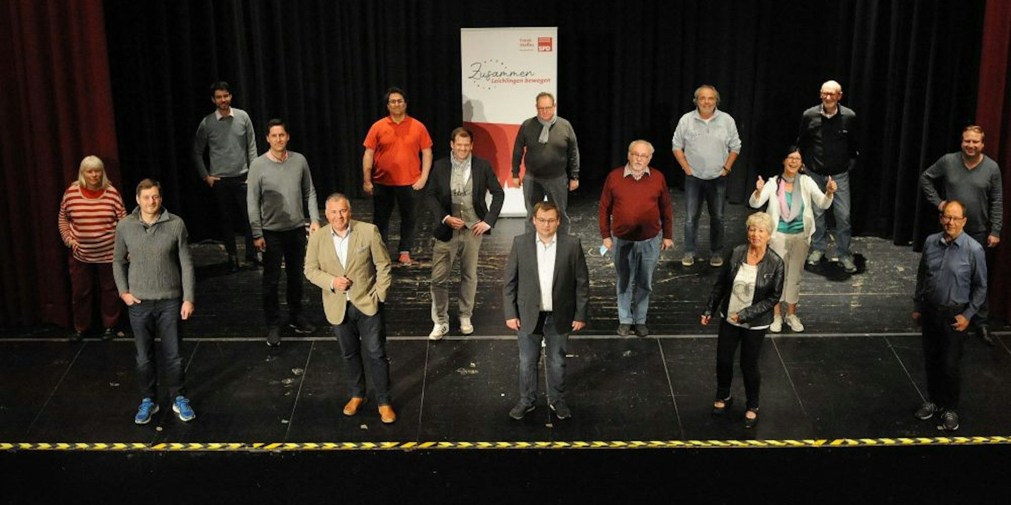 Gruppenbild mit Abstand: Die Wahlbezirks-Kandidaten der SPD mit Fraktionschef Matthias Ebecke und Bürgermeister Frank Steffes (vorne von links) auf der Bühne der Aula. Auf dem Banner hinten ihr Wahlkampfspruch „Zusammen Leichlingen bewegen“.