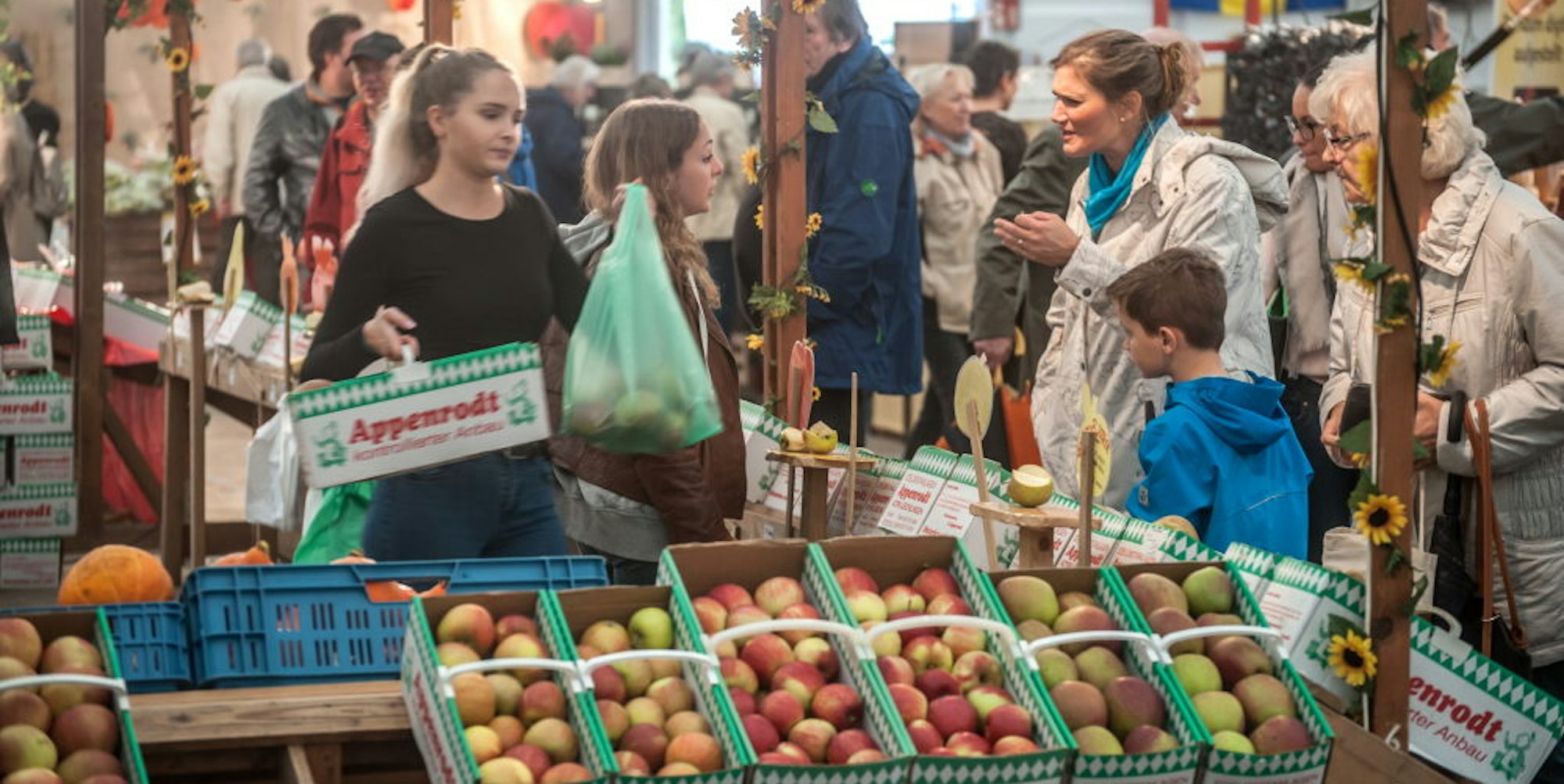 Mit Abstand und Mundschutz Äpfel probieren, würde schwierig: Der Leichlinger Obstmarkt fällt 2020 aus.