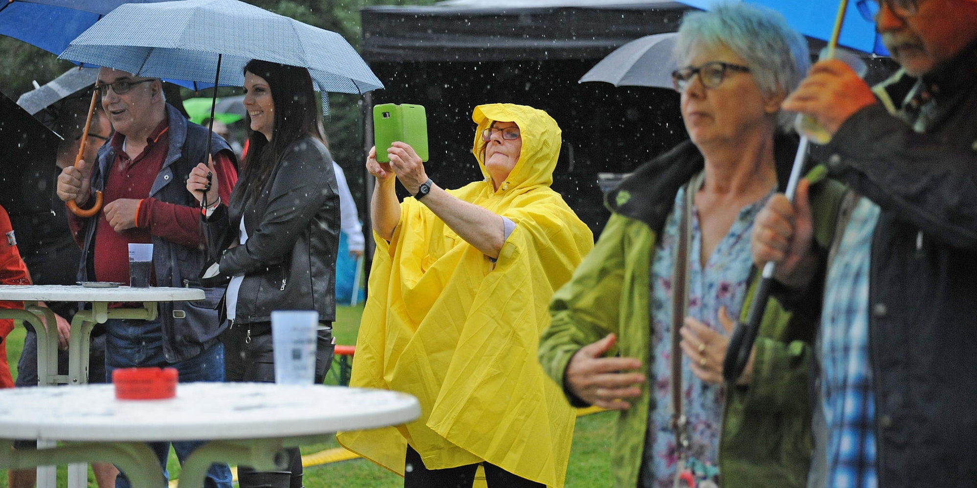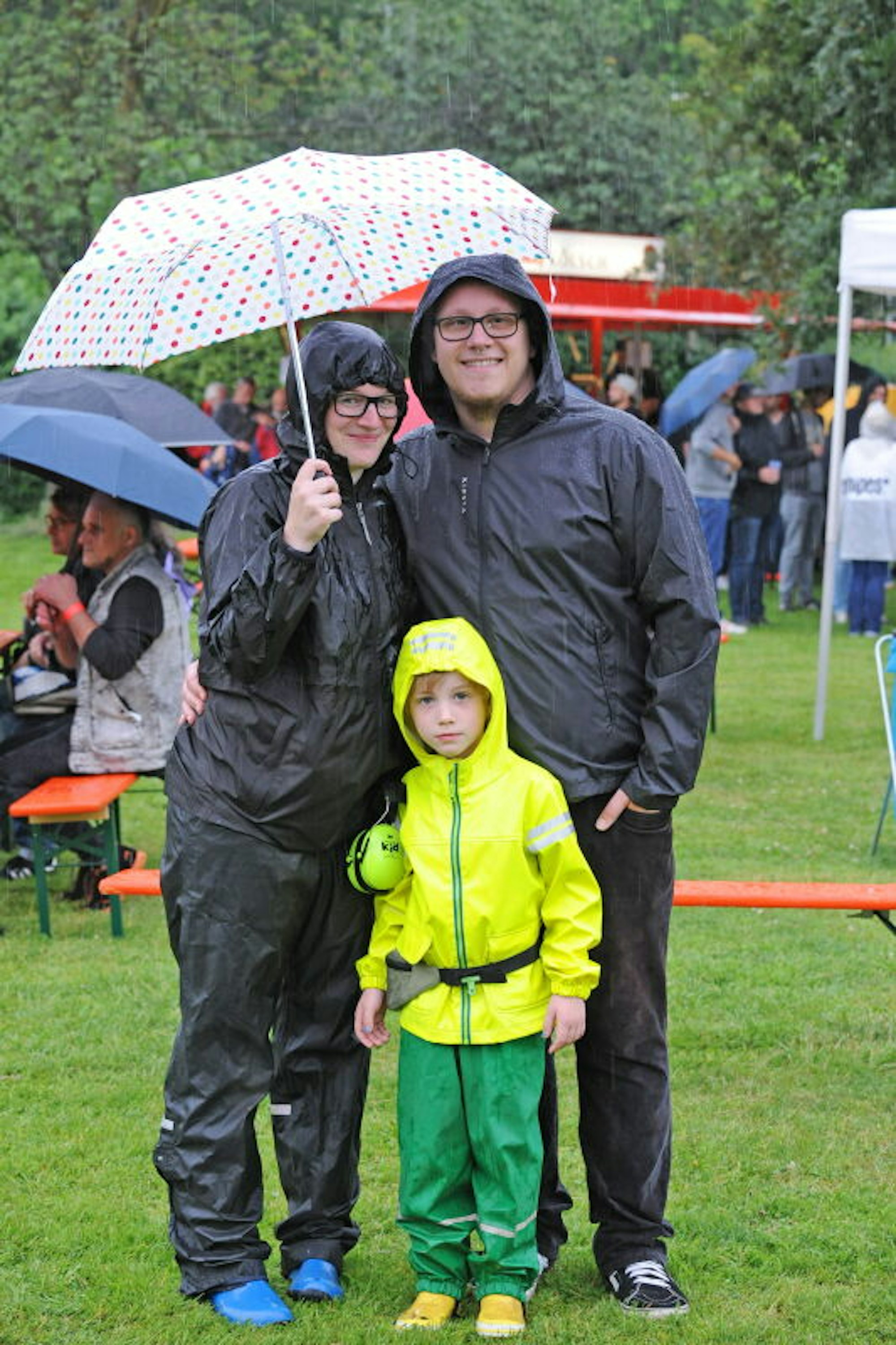 Mit Regencapes bestens für das Wetter ausgerüstet waren Sarah und Andi Neumann mit Sohn Tayo, die den Regen daher gelassen nahmen. Es sei zwar schade für die Band, da sonst mit Sicherheit viel mehr Publikum gekommen wäre, sagten sie, aber so hätten sie immerhin einen Stehtisch ergattern können: „Queen ist unsere Lieblingsband, wir gehen also erst, wenn die Kleidung komplett durch ist, hier Blitze einschlagen oder vielleicht Tayo später müde wird.“