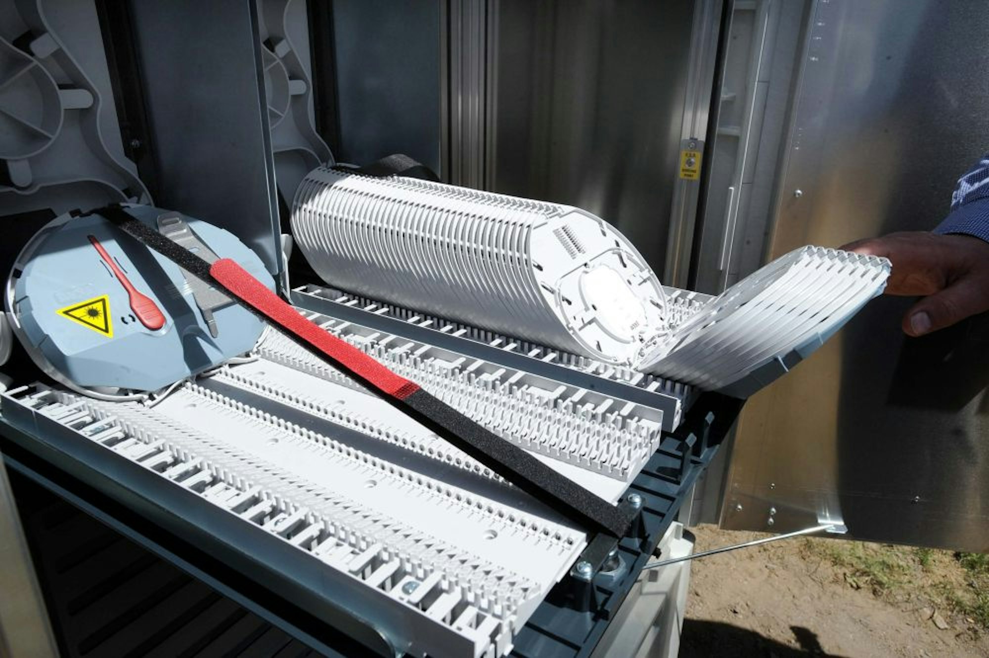 Schnelle Verbindung ins Internet: Rund 2000 Glasfasern aus Witzheldener Haushalten, gebündelt zu Kabeln, enden in der Spleißkassette des Technikschranks neben der Grundschule.