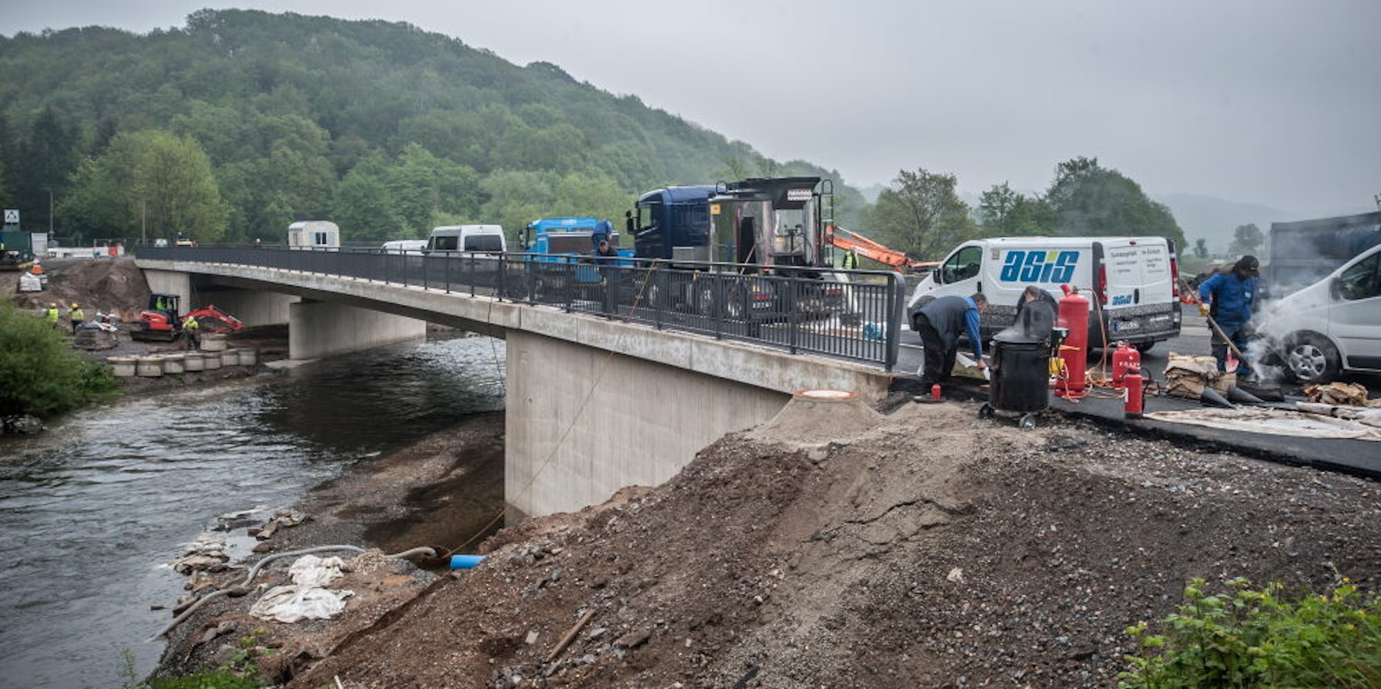Ab dann kann der Verkehr wieder über die alte Fahrstrecke der Kreisstraße 1 rollen. Dann hat die Behelfsbrücke, die 2018 nebenan errichtet wurde, ausgedient und kann abgebaut werden. Rundum sieht es an beiden Ufern zwar noch wüst aus, aber die Betonarbeiten sind erledigt, die Geländer sind installiert und die Freigabe kann – zwei Monate später als ursprünglich geplant – erfolgen.
