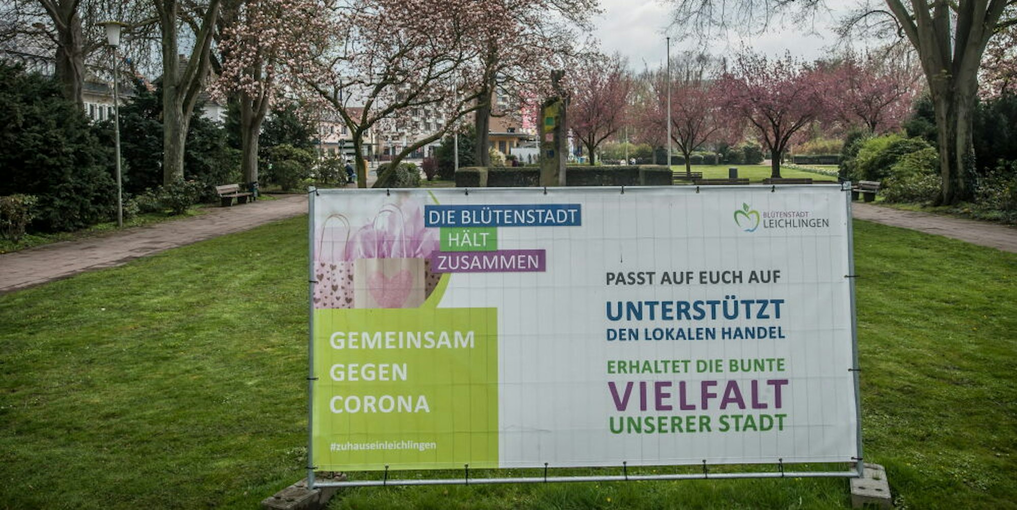 Appell an die Bürgerschaft: Die großen Banner, die an acht Stellen in der Stadt stehen (hier im Stadtpark), gehören zur Corona-Kampagne der Leichlinger Verwaltung und werben dafür, den lokalen Geschäften in dieser schwierigen Zeit die Treue zu halten.