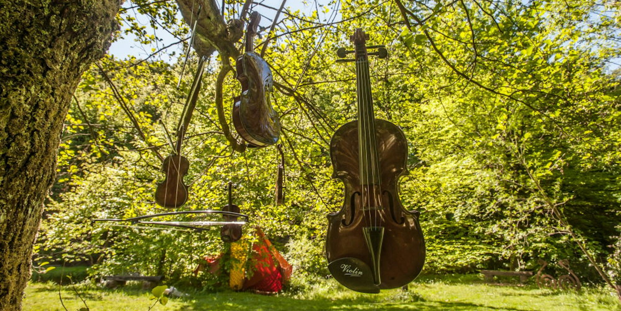 „Der Himmel hängt voller Geigen“ meint Klaus Fuisting und hat sie samt Bögen im Sinneswald in einen Baum gehängt.