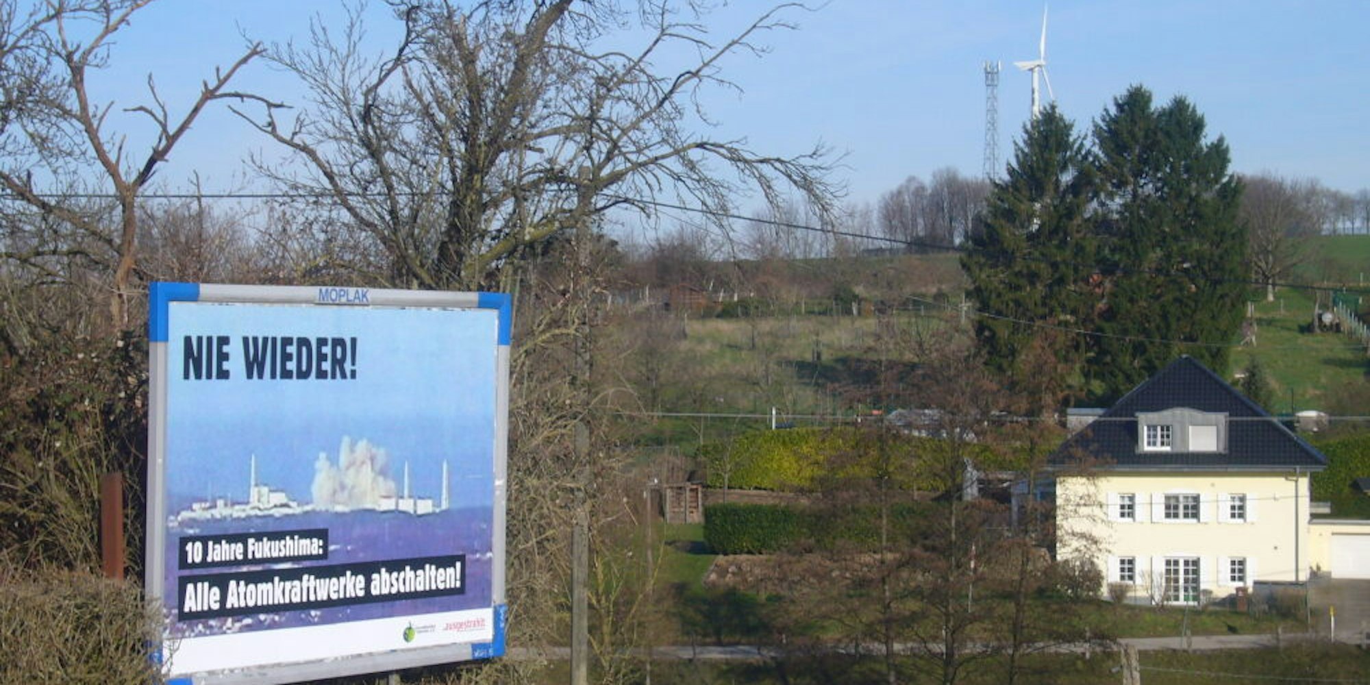Protest-Plakat zehn Jahre nach FukushimaWindrad statt Atomkraftwerke in Witzhelden