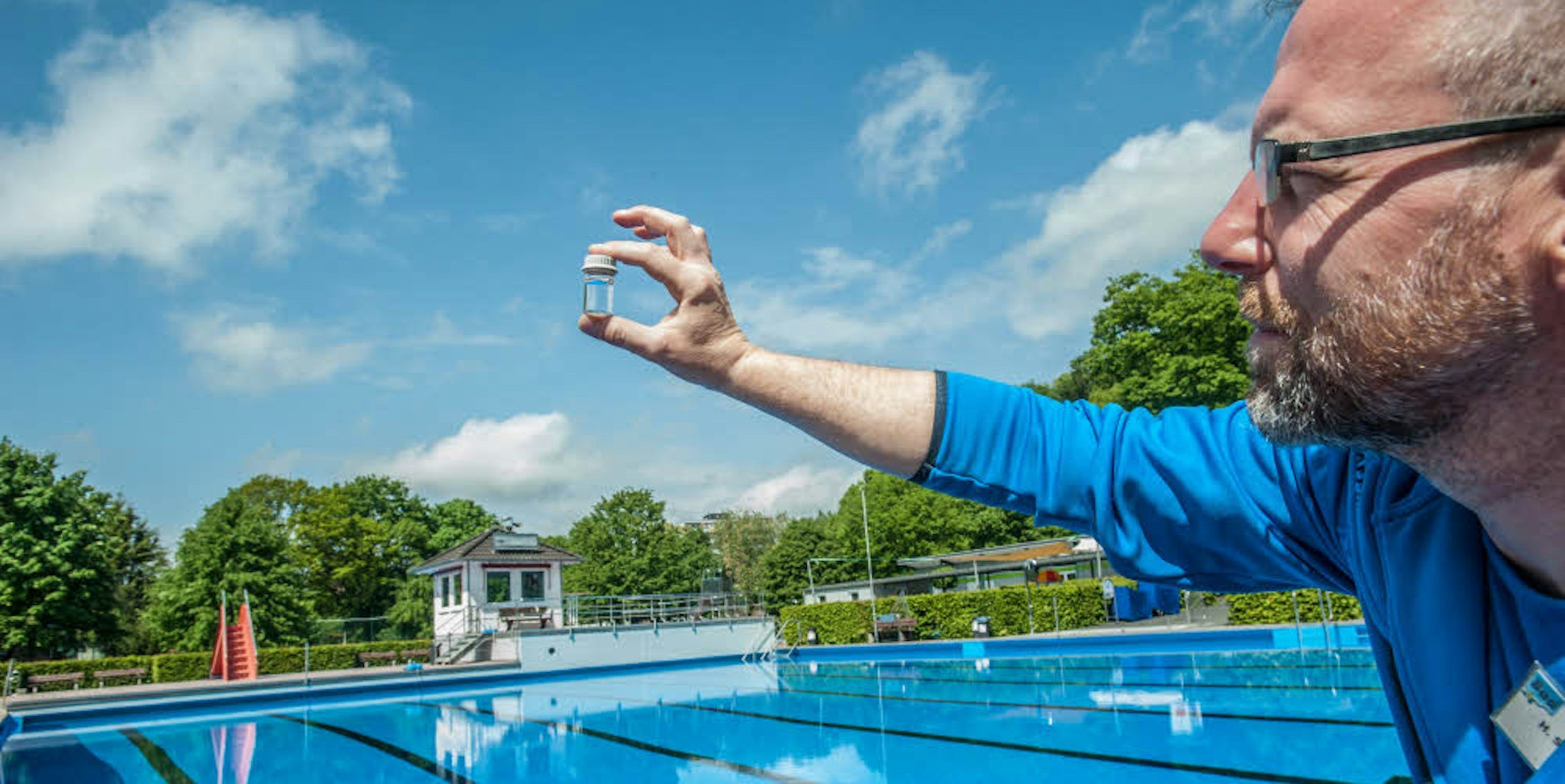 Das Freibad ist startklar: Schwimmmeister Helge Schönzeler bei einer Wasserprobe.