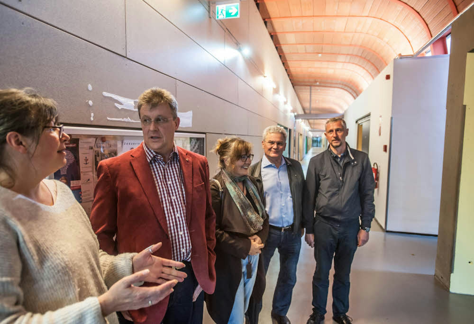 Im D-Trakt beginnt nächste Woche der Unterricht: Tracey Searle-Westerfeld (l.) vom Förderverein und Schulleiterin Kattrin Reinartz-Nebe freuten sich über die Spende der Rotarier, die (v.r.) Fritz Ellinghaus, Thomas Berrang und Bernd Sielemann überbrachten.