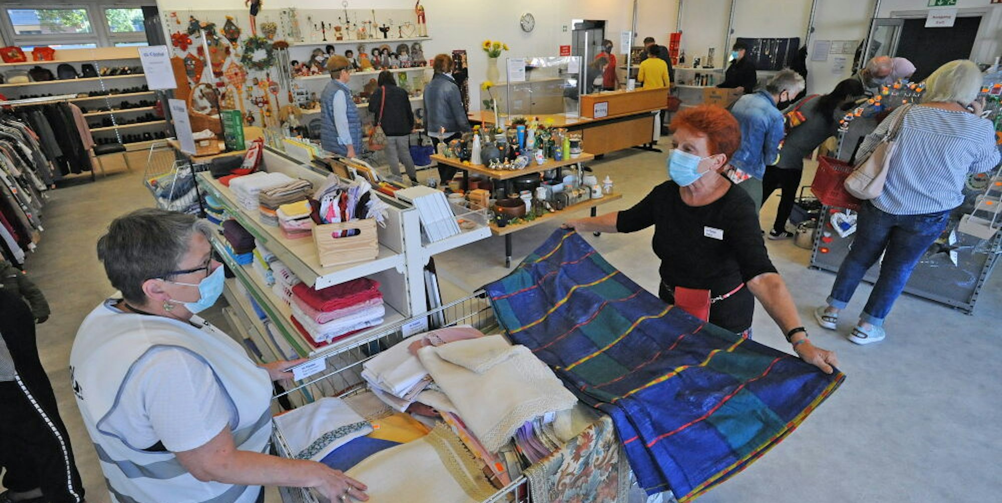 Heute, am Tag der Tage, ist sie dann auch schon um sechs in der Früh aufgestanden, um möglichst zeitig vor Ort zu sein und alles vorzubereiten für den Besucheransturm: Sie räumte mit den anderen Helfern die Regale ein, in denen jetzt von Haushaltsartikeln über Spielsachen bis hin zu Textilien alles steht und liegt und hängt, was im Alltag so notwendig ist. Zum erschwinglichen Preis. Und dann begab sie sich hinter die Kasse und begrüßt seitdem einen Menschen nach dem anderen.