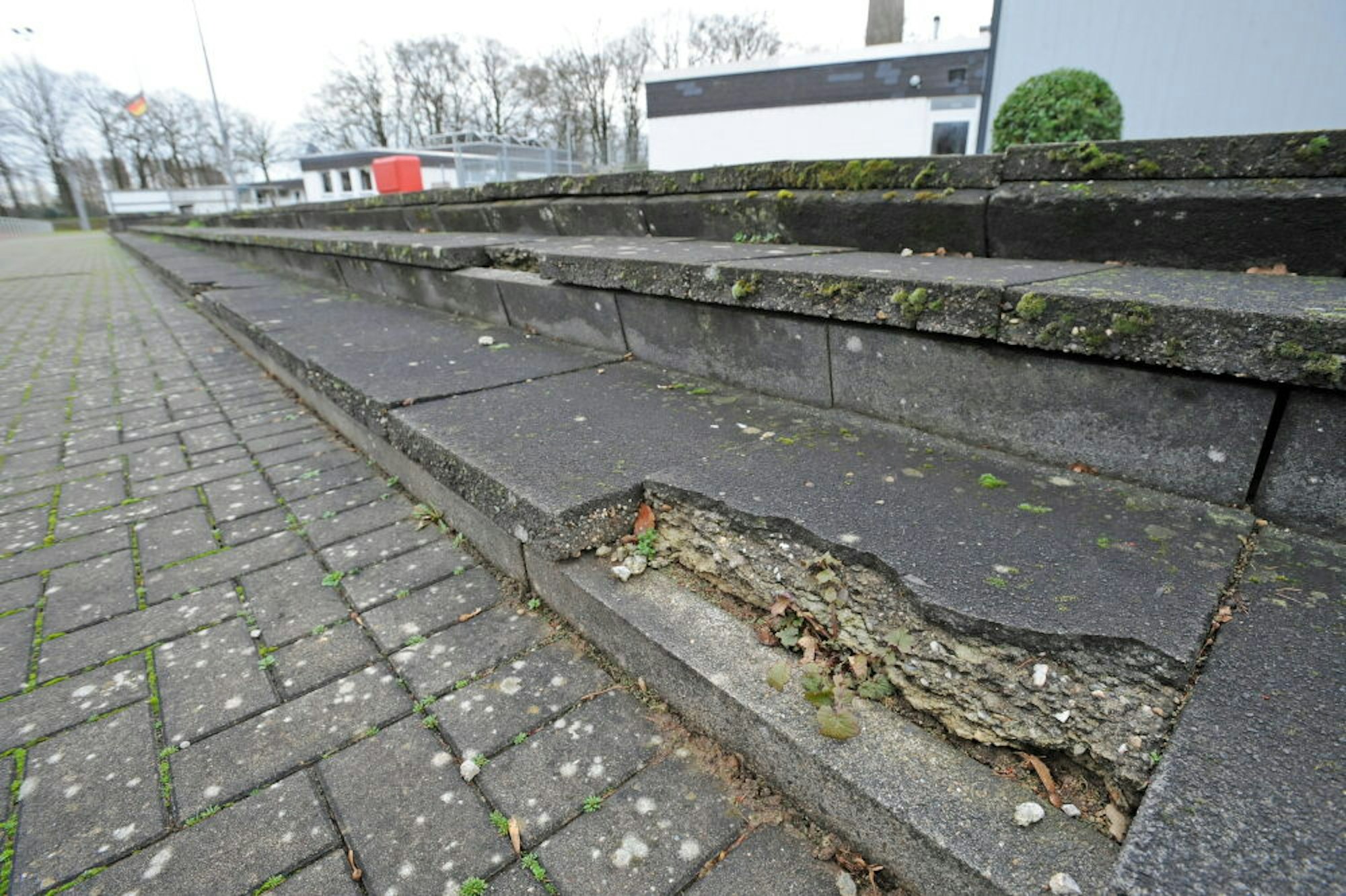 Die abbröckelnden Sitzstufen im bei Fußballspielen besonders gefragten Bereich vor dem Vereinsheim werden komplett erneuert. Die auf 35 Metern verbleibende Treppenanlage soll 280 Stehplätze oder ca. 140 Sitzmöglichkeiten bieten.
