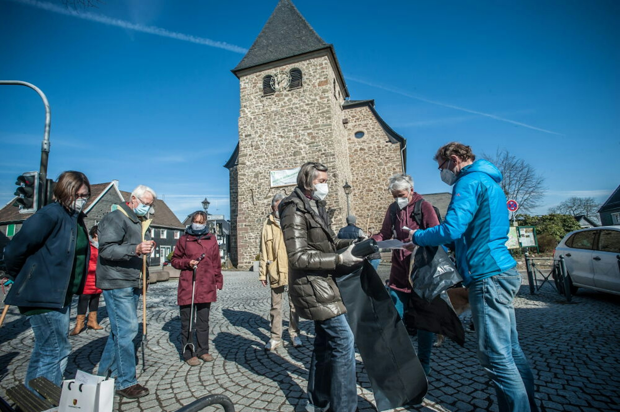 Mit Müllsäcken und Ortsplänen stattete die stellvertretende VVV-Vorsitzende Sigrid Weltersbach (Mitte) die zwei Dutzend freiwilligen Müllsammler aus, die in Witzhelden aufräumten.