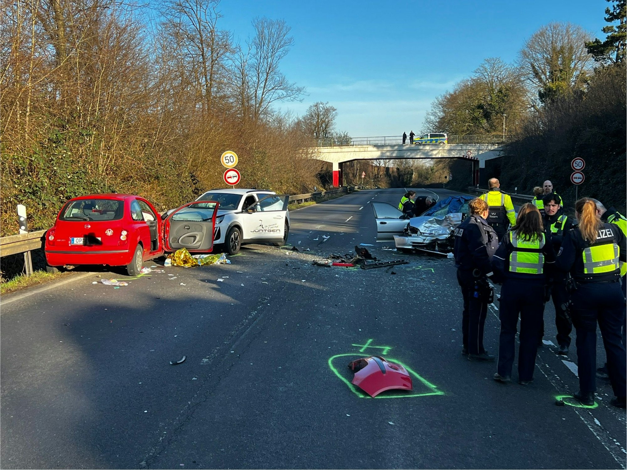 Der Fahrer (51) des Nissan, in den der silberne Unfallfahrer frontal hineingefahren war, wurde schwer verletzt. Er sei aber nicht eingeklemmt gewesen. Die Fahrerin (45) des dritten beteiligten Wagens sei leicht verletzt worden. Zwei Personen leisteten Erste Hilfe, auch sie wurden anschließend vom Rettungsdienst betreut, ins Krankenhaus mussten sie nicht. Das Verkehrsunfallaufnahmeteam sicherte auch am Mittag noch Spuren, die Bonner Straße war für Stunden in beide Richtungen gesperrt.