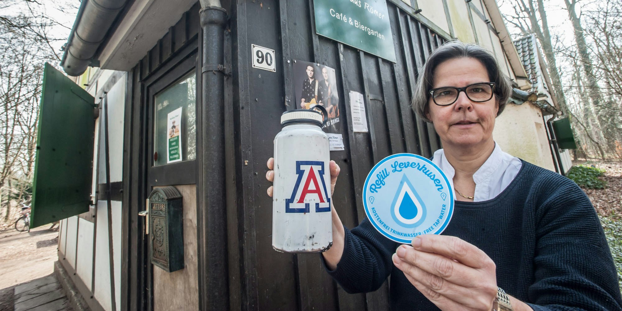 Gedacht ist das Refill-Projekt in erster Linie für Restaurants, Cafés, Bistros und Kneipen, Bioläden, Reformhäuser, Apotheken sowie Geschäfte und Unternehmen aller Art mit Publikumsverkehr und einem frei zugänglichen Wasseranschluss. Wer dabei mitmacht, ist nicht nur an dem blauen Aufkleber, sondern auch auf einer Karte im Internet ersichtlich. In Leverkusen betreut Britta Demmer vom Naturgut Ophoven die Aktion, die im März 2017 von der britischen Insel nach Deutschland übergeschwappt ist. Sigrid Fischer, die das Waldhaus Römer betreibt, war Demmers erste Ansprechpartnerin und erklärte sich sofort zur Mitarbeit bereit, „weil wir Leitungswasser bisher auch schon kostenlos an Wanderer abgegeben haben“.