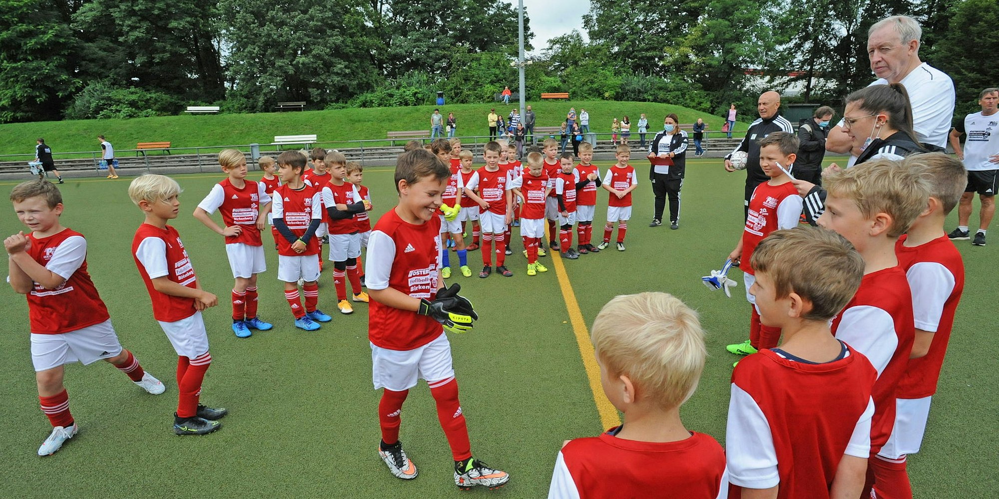 Der Name des Camps prangt auch zum 20. Jubiläum groß auf den roten T-Shirts – statt findet es allerdings wie seit mehreren Jahren nicht auf dem Opladener Birkenberg, sondern auf der Sportplatzanlage des SC Leverkusen unweit des Bayer-Stadions. „Hier haben wir einen schönen Kunstrasen, ihr könnt Euch vorstellen, dass das Fußballspielen nach dem Dauerregen auf dem Birkenberg heute nicht so viel Spaß machen würde“, sagt Organisator Thomas Edelmann den Kindern bei der Begrüßung, zu der auch der Oberbürgermeister anwesend war und versprach: „Irgendwann bekommt auch der Birkenberg seinen Kunstrasen.“