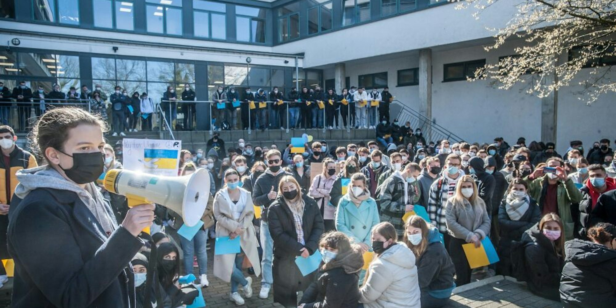Und so, wie es sich entwickelte, entwickelte es sich gut: Viktoriia sprach und bekam viel Zuspruch. Eine Gruppe von Jugendlichen lasen aus einer Radiosendung stammende Erfahrungsberichte von Menschen vor, die in der Ukraine festsitzen und die schauerliche Szenerie in ihrer Heimat beschreiben. Schulpfarrer Oliver Flader rief zu einer Schweigeminute auf. Jonas Völler, er unterrichtet Gesellschaftslehre und Biologie, hielt eine flammende Rede wider die Unmenschlichkeit des Krieges.