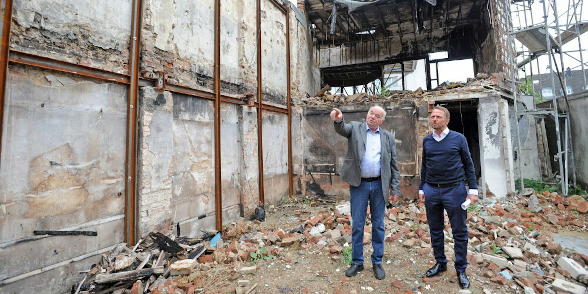 Johannes Krämer und Uwe Richrath auf dem Grundstück der abgerissenen Brandruine.