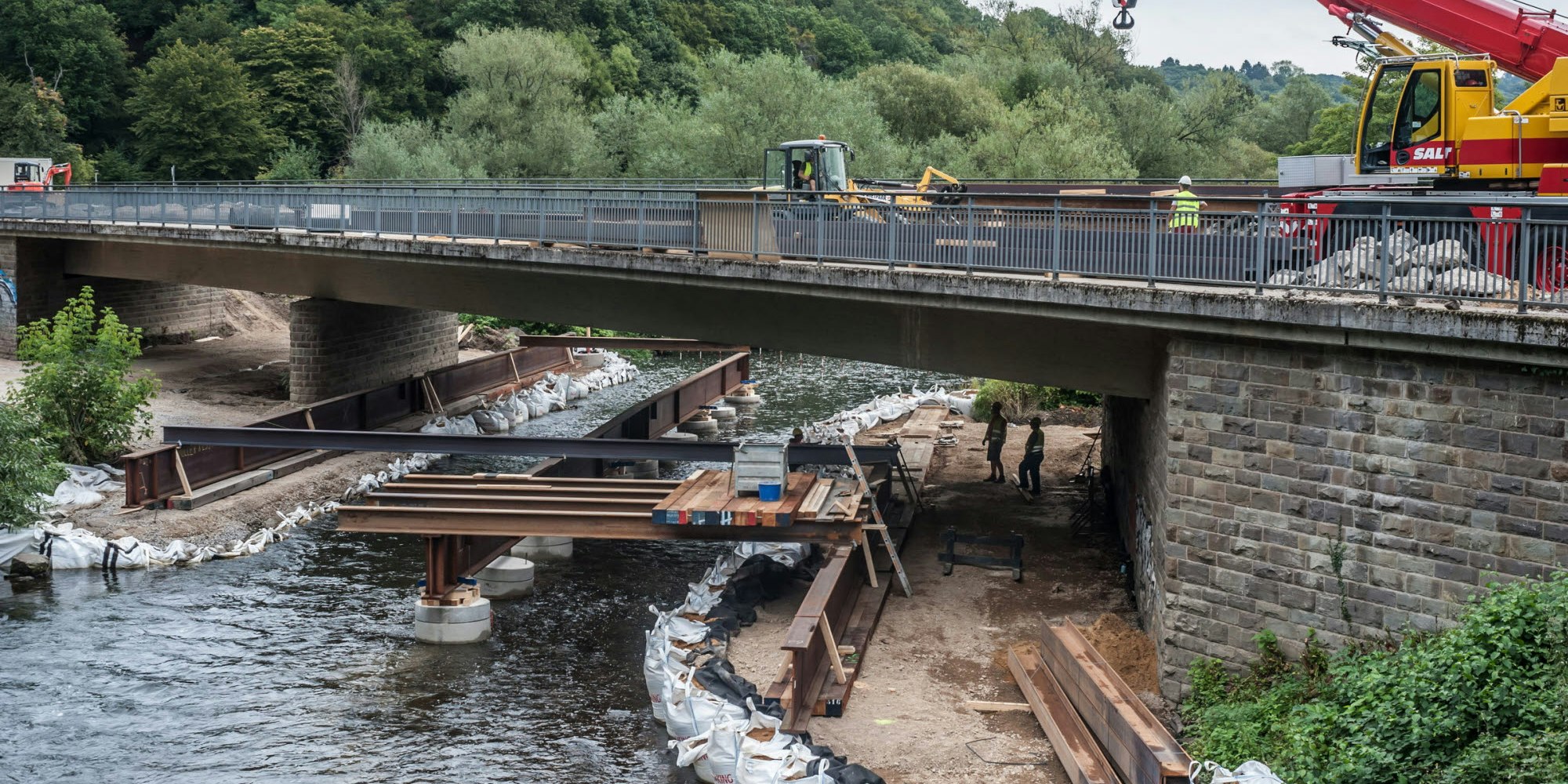 Leichlingen – Einen spektakulären Anblick bietet die Baustelle der Wupperbrücke zwischen Leichlingen und Solingen bei Haasenmühle. Man könnte fast glauben, dass hier ein Trockendock oder eine Schleuse für Schiffe gebaut wird. Inzwischen ist der Asphalt der Fahrbahn abgefräst, sind Betonpodeste in der Flussmitte versenkt und mit Hilfe eines Kranwagens weitere Uferbefestigungen verlegt worden, auf denen eine Arbeitsbühne unter der Brücke verankert wird. Sie soll wie berichtet verhindern, dass beim Abbruch der maroden alten Stahlbetonbrücke Bauschutt in die unter Naturschutz stehende Wupper fällt. Aber der eigentliche Abbruch hat noch nicht begonnen. Vorgesehen war, dass Bagger die Brücke am Donnerstag von der Mitte aus zerteilen sollten. Aber der Zeitplan hat sich verzögert, weil es Probleme bei der Anlieferung der Stahlträger gab. Sie sind erforderlich, um das Arbeitsgerüst über der Wupper zu bauen und die mit dicken Holzbohlen ausgelegten Fahrwege für die Bagger zu befestigen, die den Schutt zum Abtransport auf Lkw verladen müssen. Wie die Stadt Solingen auf Anfrage mitteilte, beginnt der Angriff auf den Beton am Montag. (hgb)
