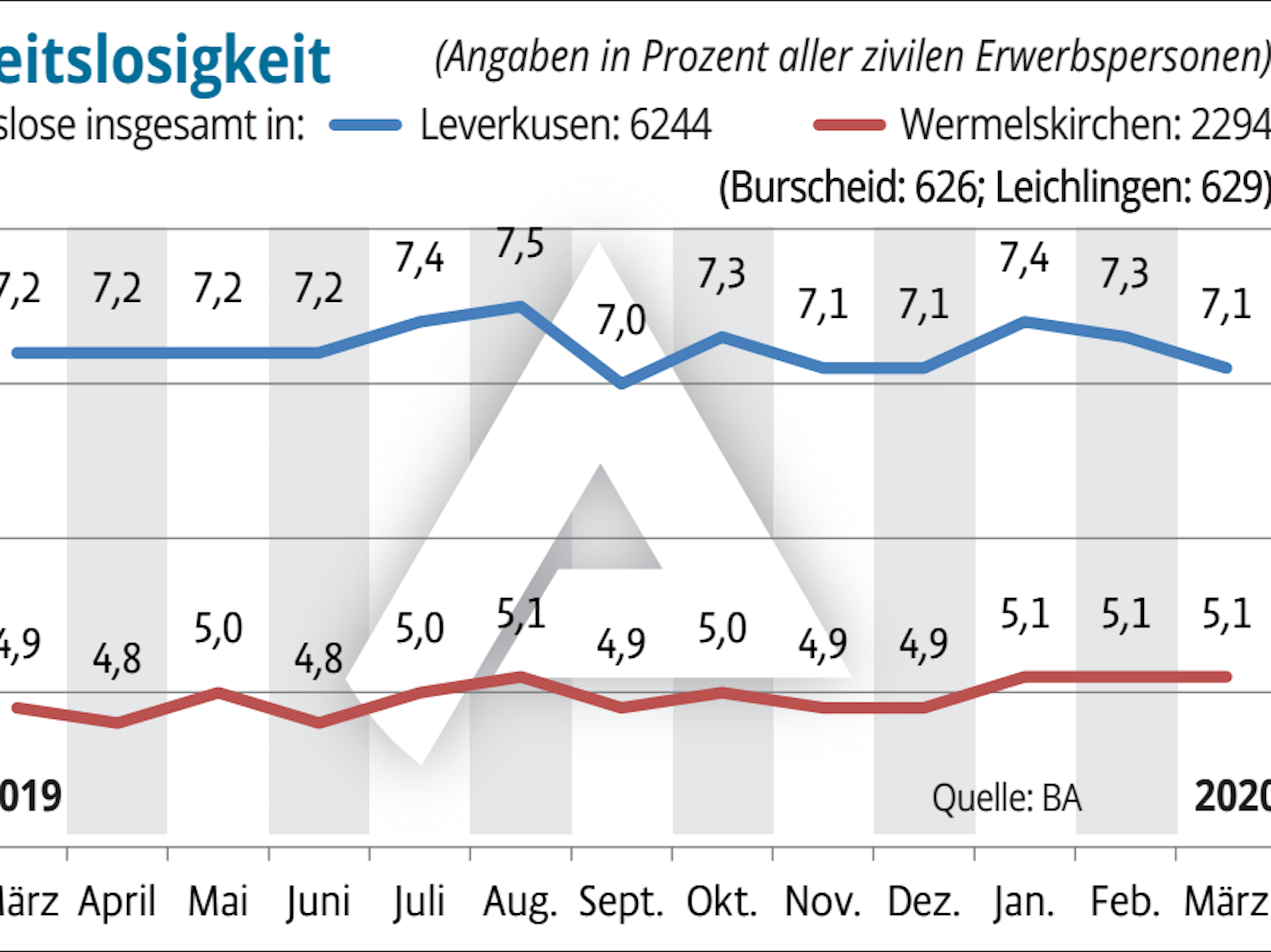 In Leichlingen suchten im März 629 Personen einen Job. Gegenüber Februar gibt es praktisch keine Veränderung; verglichen mit März 2019 ist das aber eine weitere leichte Verbesserung. Die Quote in Leichlingen lag Mitte März bei 4,1 Prozent; das sind zwei Zehntel weniger als voriges Jahr. Das Angebot an Stellen lag bei 127 und damit etwas niedriger als zuvor.