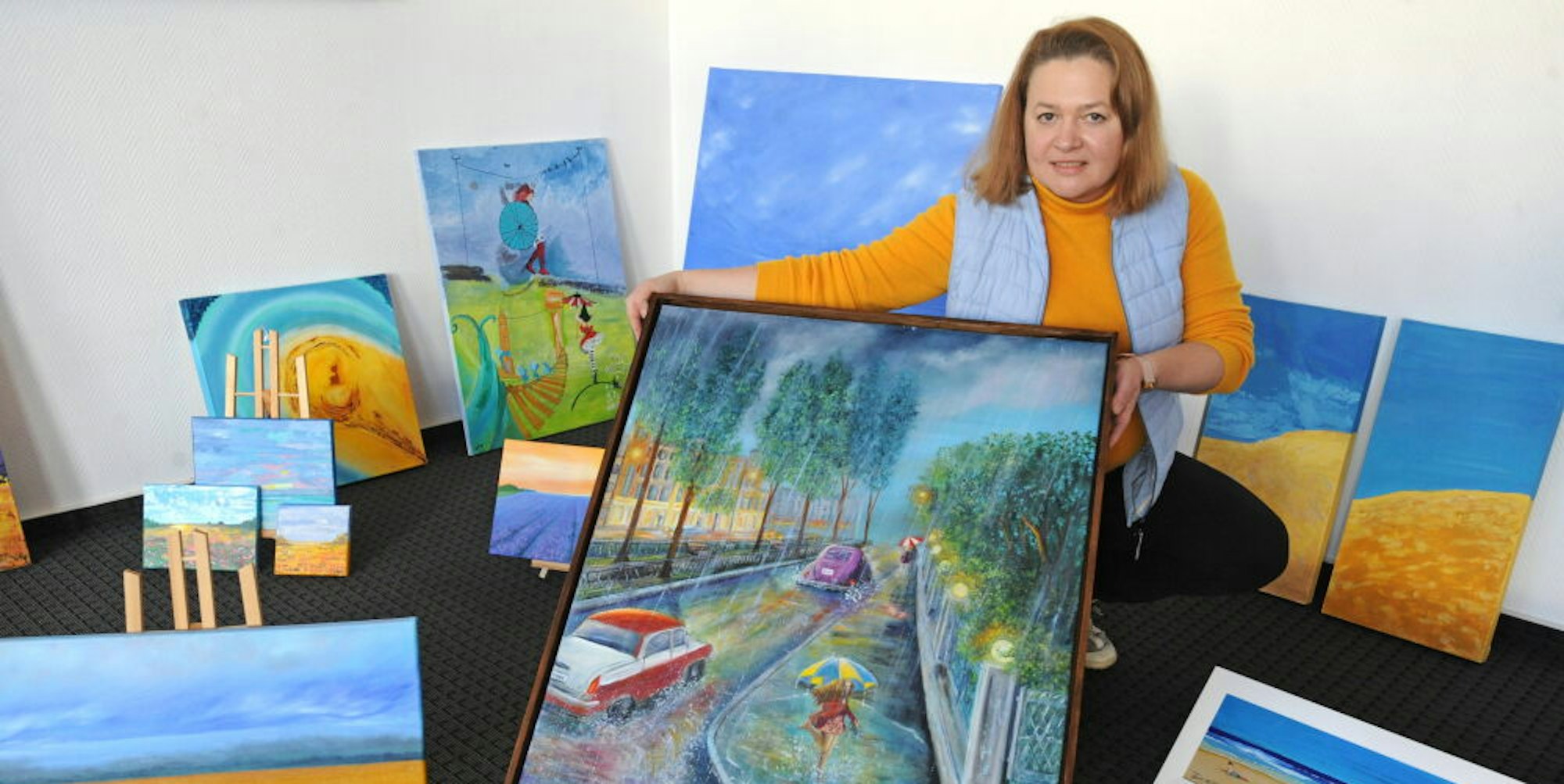 Denn die 45-Jährige mag beruflich IT-Beraterin sein. Aber sie ist seit einigen Jahren eben auch Malerin. Künstlerin. Stillleben und Landschaftsansichten mit Blumen sind ihr Metier. Jetzt malt sie Bilder, auf denen die Farben Blau und Geld, die Farben der ukrainischen Flagge, zu sehen sind – und will sie ab Freitag, 11. März, in ihrem Atelier „Tum-Art“ am Akazienweg 5 in Bergisch Neukirchen präsentieren.