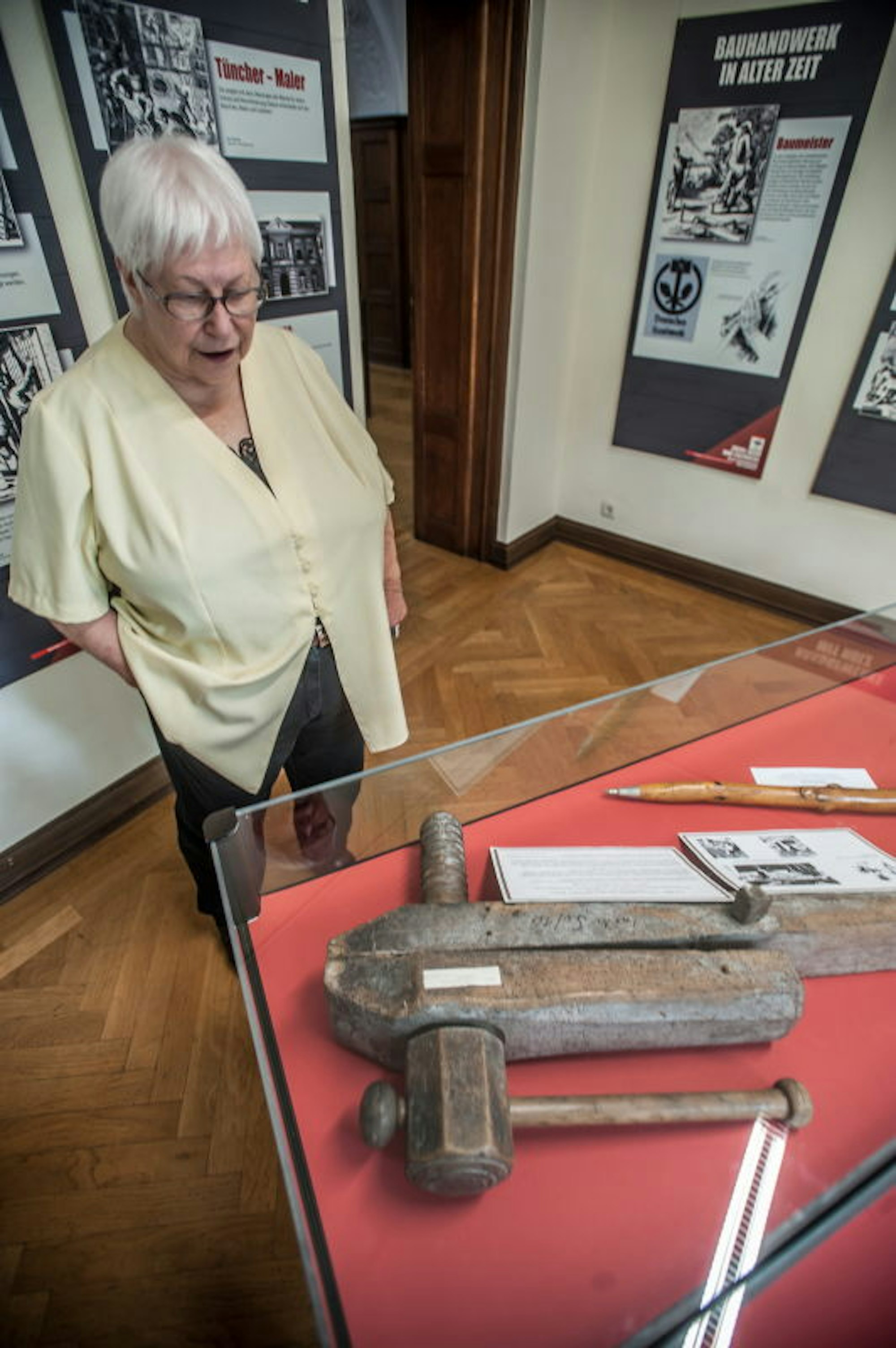 Helga Kruse-Klemusch betrachtet das alte Werkzeug in einer Vitrine.