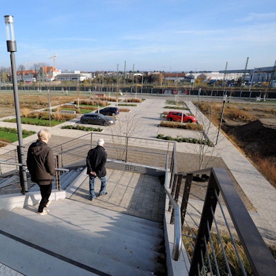 Weil die Rampe dem Bau des Parkhauses für die Räder im Weg steht, muss sie eine Zeit lang aus dem Weg geräumt werden. Im Winter werde sie dann mit etwas nördlichem Versatz und um ein Element verlängert wieder aufgebaut. Dann erreicht sie auch das Niveau des neuen Busbahnhofs, der etwas tiefer liegt. An den sechs Prozent Steigung für Radler ändere sich auch nichts, erklärte am Freitag Andreas Schönfeld, einer von zwei Chefs der Bahnstadt-Gesellschaft.