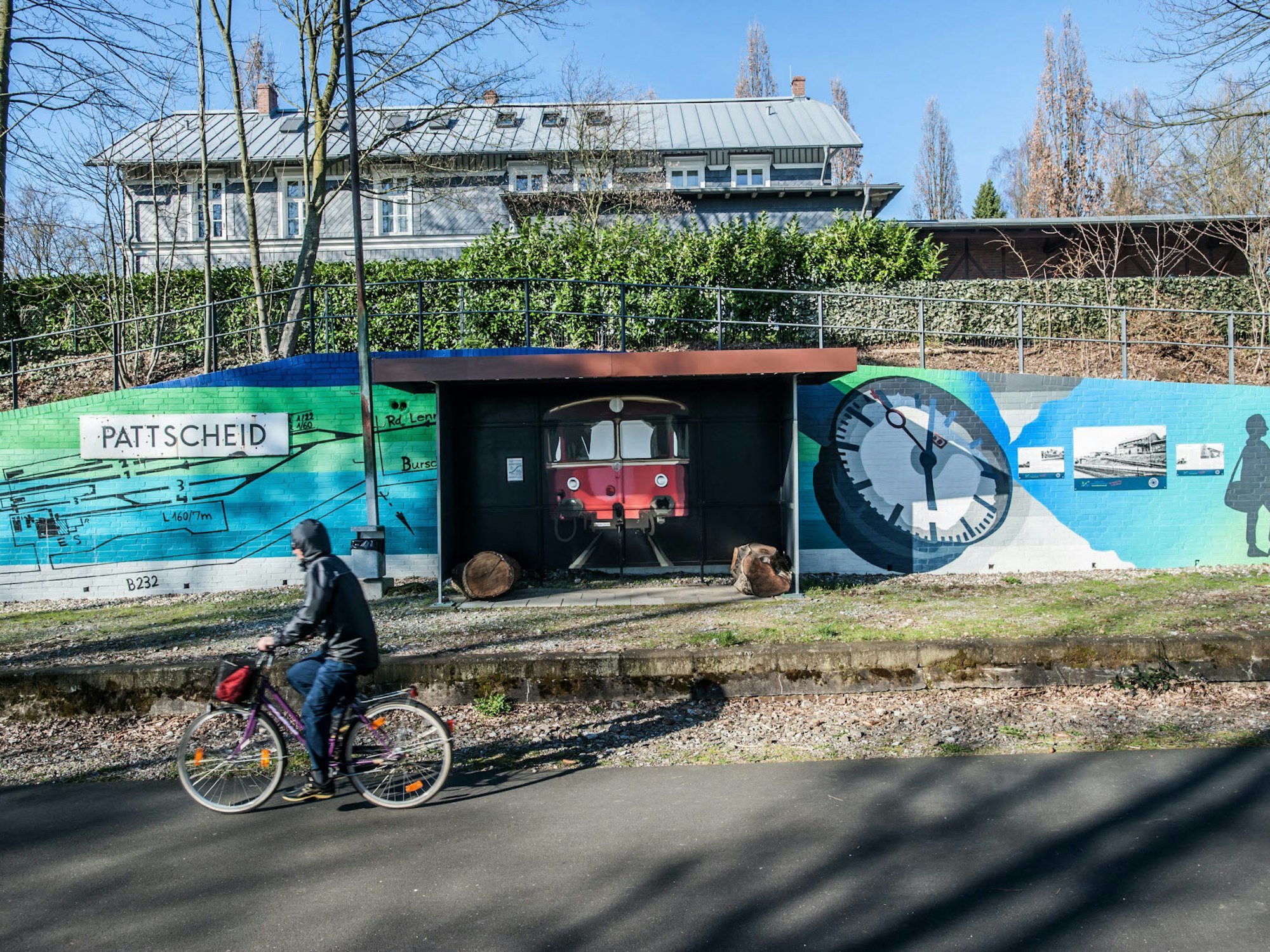 Ein Hingucker. Der Förderverein ließ nach der Spende eines Mitglieds das frühere Wartehäuschen am Bahnhof Pattscheid mit einem Graffito von Andreas Nigge künstlerisch gestalten.
