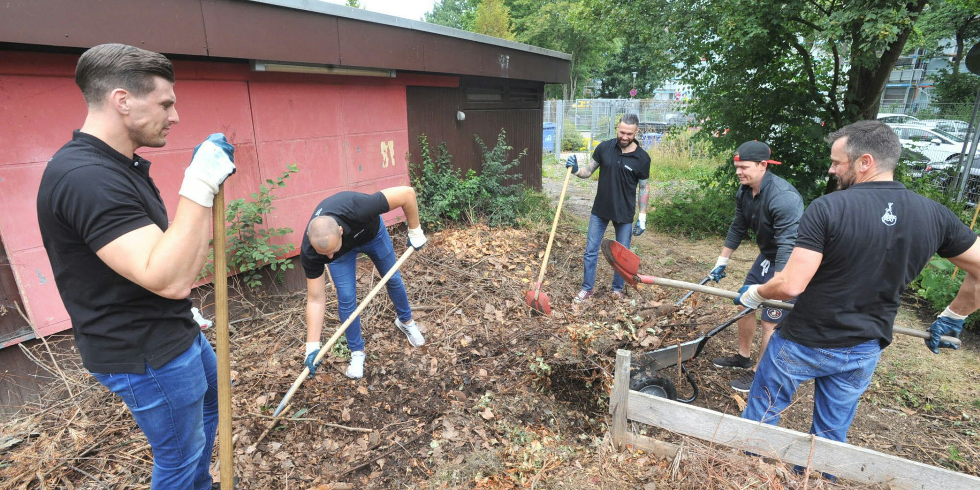 Hamza Abdiji und Jeremias Pütz von der Firma Kronos Titan kamen ganz schön ins Schwitzen – was kein Wunder war: Beide schoben Schubkarren mit Ästen und Erde hin und her. Immer wieder: Aufladen, losgehen, entladen. Sie taten das auch noch an einem Wochenende. Und dennoch lächelten sie, weil sie freiwillig für einen guten Zweck schwitzten: Gemeinsam mit gut 30 Kollegen brachten sie nämlich das Außengelände des Bauspielplatzes an der Rheindorfer Oderstraße auf Vordermann. Damit die Kinder, die hier in den kommenden Ferienwochen spielen wollen, dies auch ohne Einschränkung tun können.