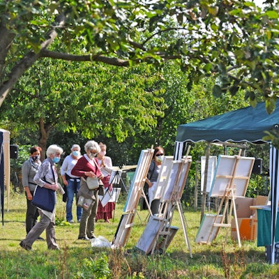 Versteckt hinter einer Hecke bot sich den Besucherinnen und Besuchern des Basars ein besonderer Anblick: Auf einer großen Wiese stellten Künstlerinnen und Künstler ihre Gemälde, Handarbeiten und Skulpturen zur Schau. „Der Basar fühlt sich schon fast an wie ein Festival“, erzählt Norbert Kaluza, einer der Organisatoren der Veranstaltung. „Wir haben Live-Musik, schönes Wetter und großartige Kunstwerke.“