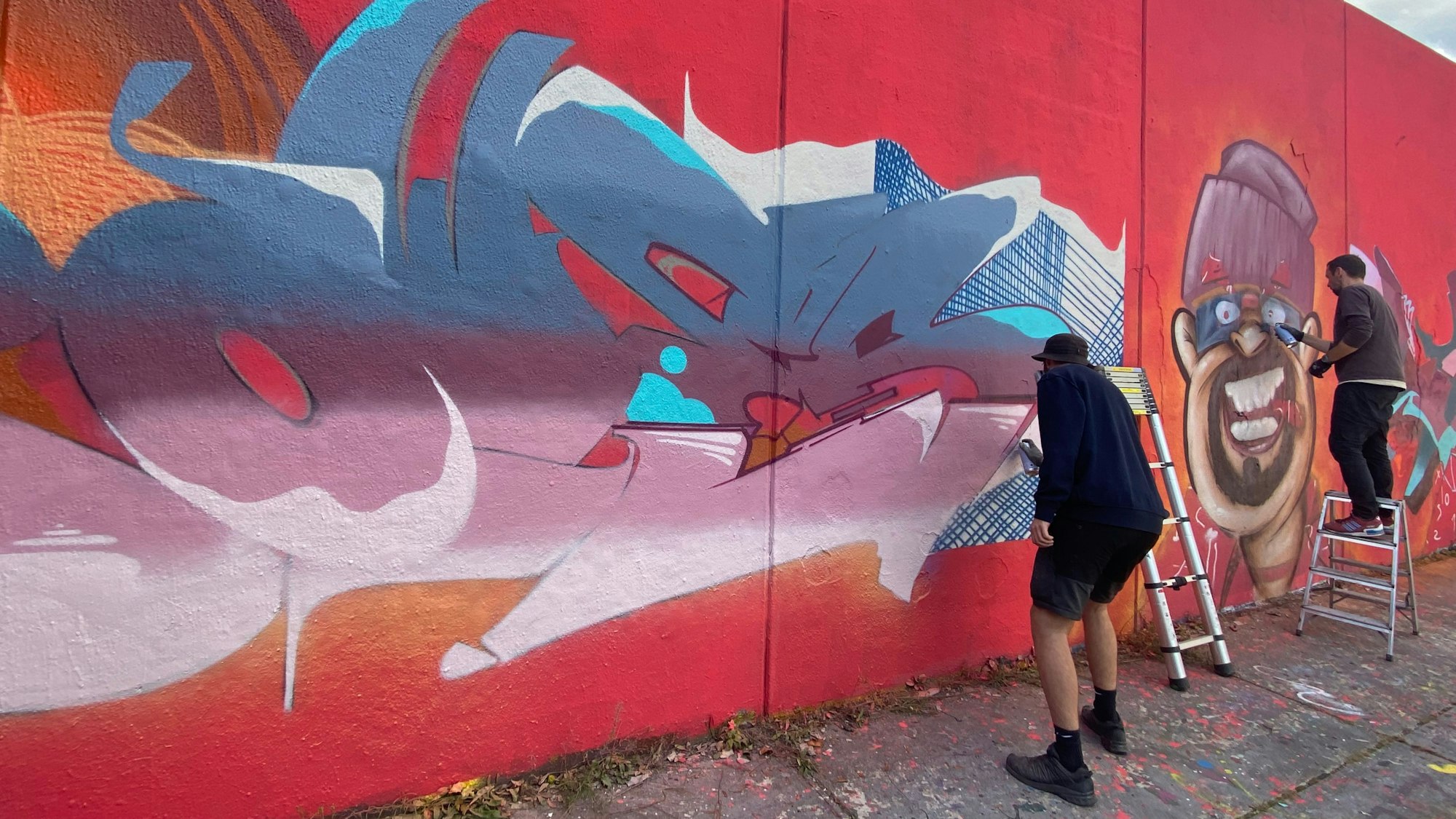 Ab 11 Uhr begannen die Graffitikünstler damit, die zur Verfügung gestellten Wände zu besprayen und die bis dahin grauen Fläche zum Leben zu erwecken. Unter den Künstlern war Bowes (Künstlername) aus Hilden. Der 30-Jährige sprayt seit 14 Jahren; er hat in der Schule mit Freunden angefangen. Die Skizzen der Gruppe sind im Unterricht entstanden und während viele seiner Freunde mittlerweile mit der Kunst abgeschlossen haben, ist sie für Bowes immer noch ein Teil seines Lebens. „Für mich gibt es einfach keine schönere Ausdrucksweise als die Kunst. Hier bin ich frei, es gibt keine Regeln und man kann einfach drauf loslegen und das visualisieren, worauf man gerade Lust hat“, erklärte der Künstler. Auch an diesem Tag kam er ohne einen genauen Plan nach Opladen, da er sich ohnehin erst die Wand und deren Format ansehen muss, um zu wissen, was am besten passen würde. „Für mich ist das hier das schönste Zusammenkommen überhaupt und ich könnte mir nicht vorstellen, mein Wochenende besser zu verbringen“, freute sich der Hildener.