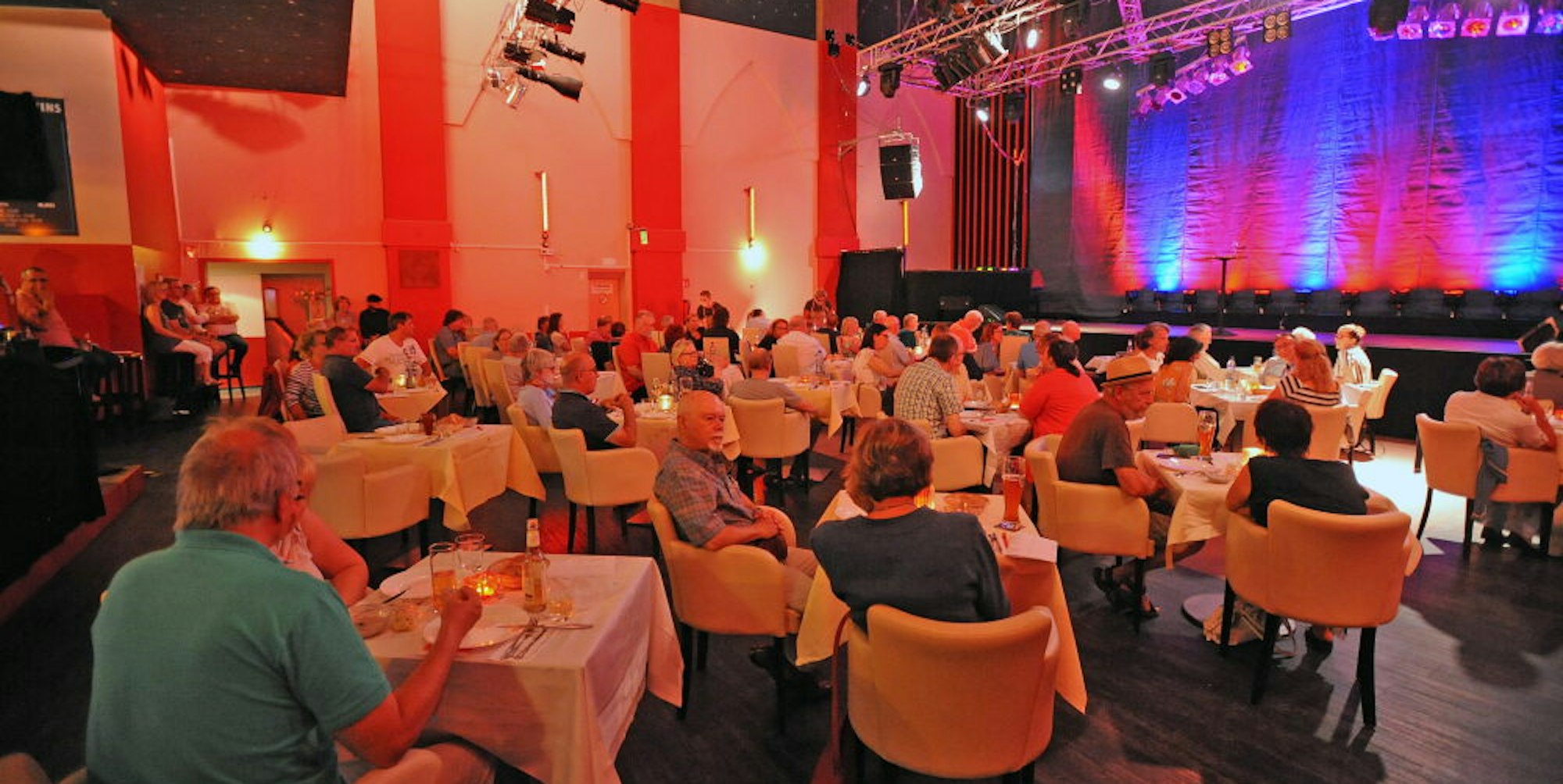 Genau 100 Zuschauer im Club: Zum Neustart im Opladener Scala bekam jeder Besucher seinen personalisierten Platz am Tisch vor der Bühne.