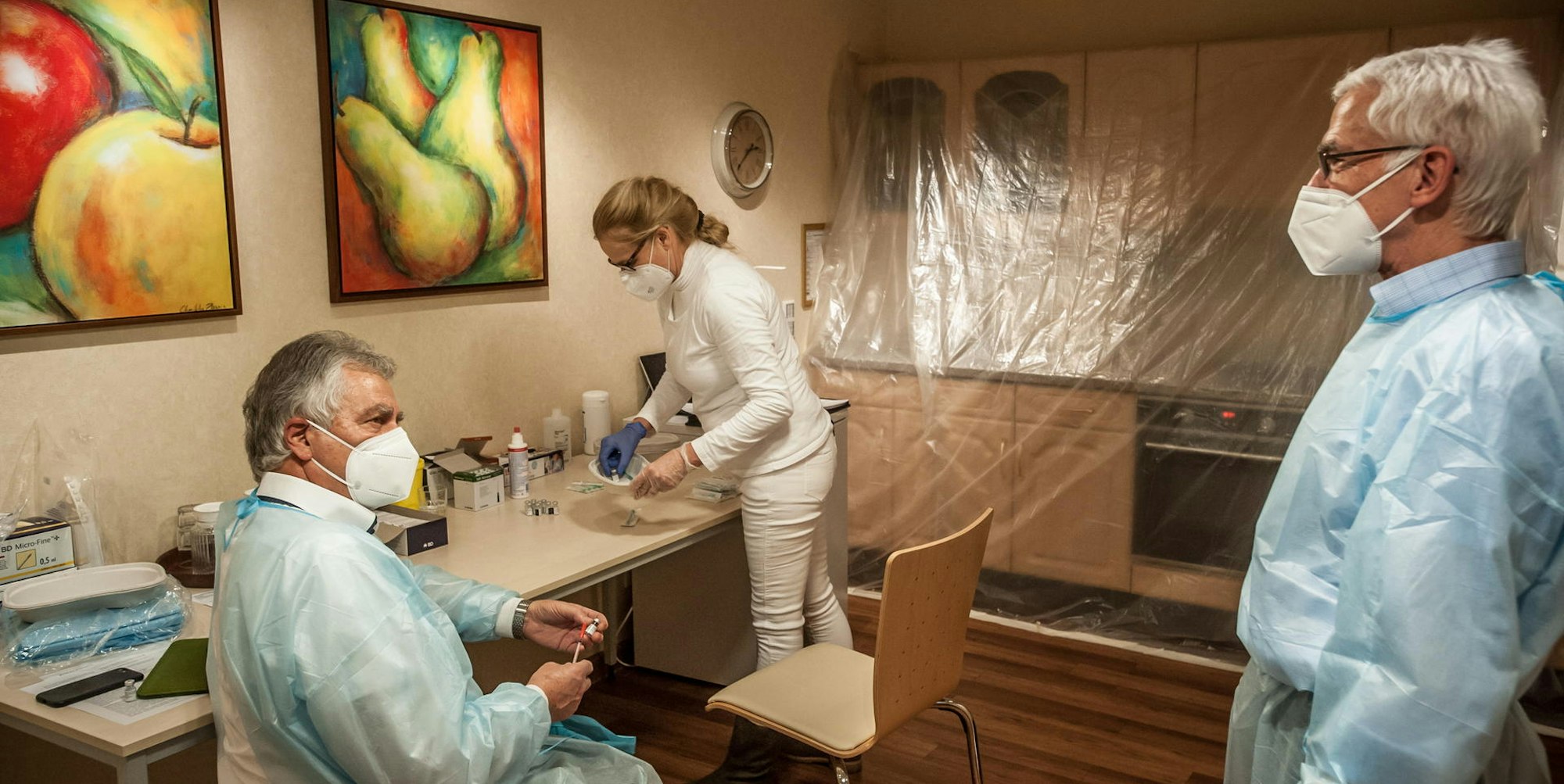 Entspannung, nachdem am 27. Dezember in der Wiesdorfer Pflege-Residenz die letzte Spritze aufgezogen war. In dem Raum wurden die Impfdosen vorbereitet.