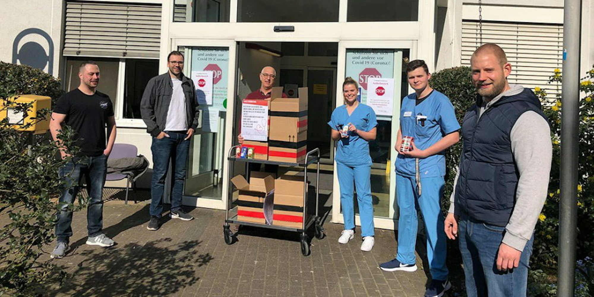 Pakete voller Schokolade und Energiedrinks hat Marcel Avermiddig (2.v.l.) von den Leverkusener Ultras dem Team des Remigius Krankenhauses in Opladen diese Woche übergeben.