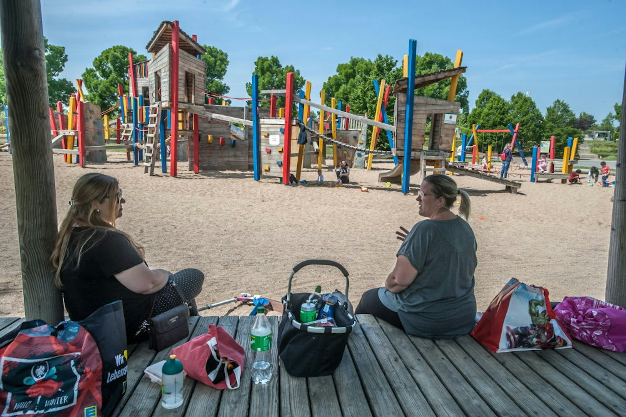 Nun haben auch wieder die Spielplätze geöffnet. Manch kleines Wippgerät ist noch immer mit Flatterband in eine Kunstinstallation verwandelt. Auf dem großen Spielplatz im Neulandpark namens „Kuddel Muddel“ herrscht jedoch bereits, ja, genau... Die Eltern schauen misstrauisch auf die sich nähernde Journalistin, bereit, jede Schuldzuweisung abzustreiten. Noch hangeln sich die Kinder mit Abstand an den Gerüsten entlang, fest im Blick der sorgsamen Mütter und Väter. „Wenn sie sich beim Spielen zu nahe kommen, dann läuft man halt schnell hin, packt sie, und bringt sie wieder auseinander“, erklärt eine Mutter den Plan.
