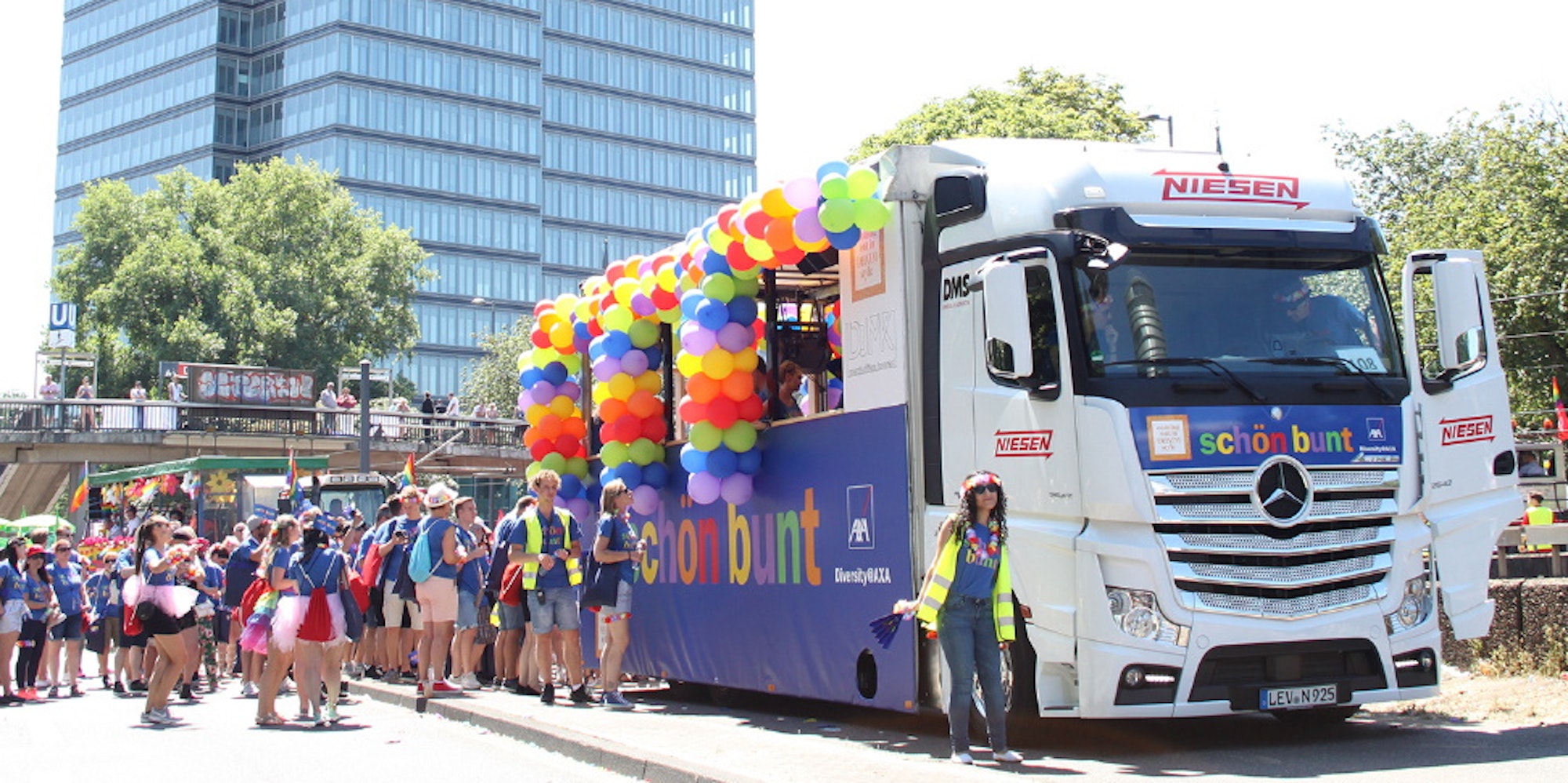 Leverkusen/Köln – Wenn sich am Sonntag die Parade zum Christopher Street Day mit zigtausenden von Teilnehmern durch Köln wälzt, werden zwei der rund 80 darin mitfahrenden Lkw aus Leverkusen kommen. Die Leverkusener Spedition Niesen hat zwei Event-Trucks partytauglich dekoriert und ausgerüstet, damit die partywütigen Mitarbeiter der Versicherungskonzerne Axa und Zurich so richtig gepflegt abfeiern können. Axa bucht den Service aus Leverkusen bereits seit 2016 für seine Mitarbeiter an den Kölner Standorten, die Zurich Versicherung, die in diesem Jahr einen neuen Standort nahe der Messe in Deutz bezieht, ist dieses Jahr erstmals dabei.