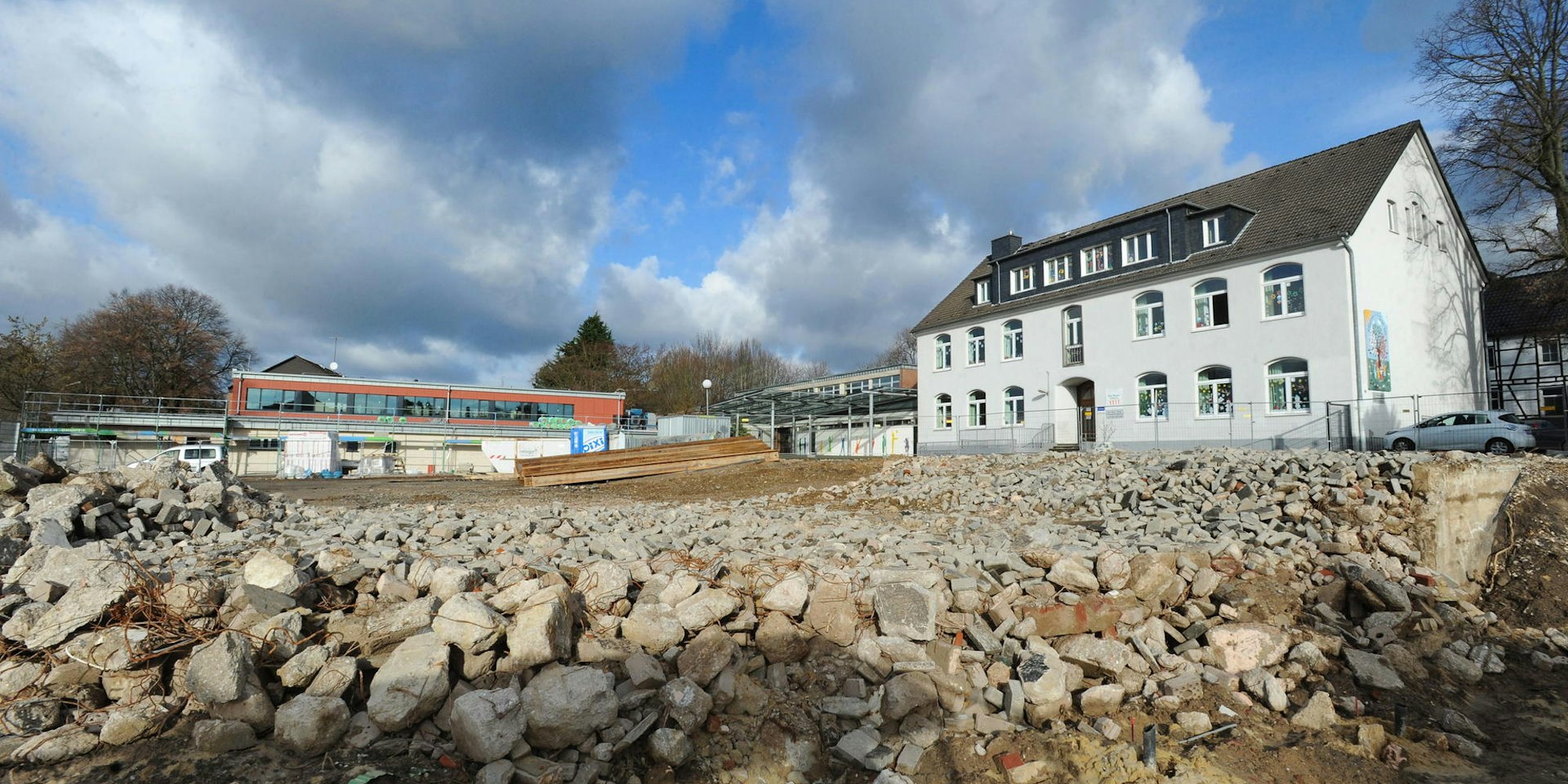 Einiges ist an der Quettinger Straße bereits geschehen: Insgesamt 13 Bäume mussten weichen, die alten Verwaltungsgebäude, die ehemalige Hausmeisterwohnung und provisorische Mensa wurde abgerissen. Derzeit laufen Erd- und Verbauarbeiten als Vorbereitung für den Neubau. Im Vorgriff auf den Abbruch wurde eine Ersatzcontaineranlage für die Auslagerung der Verwaltung errichtet.