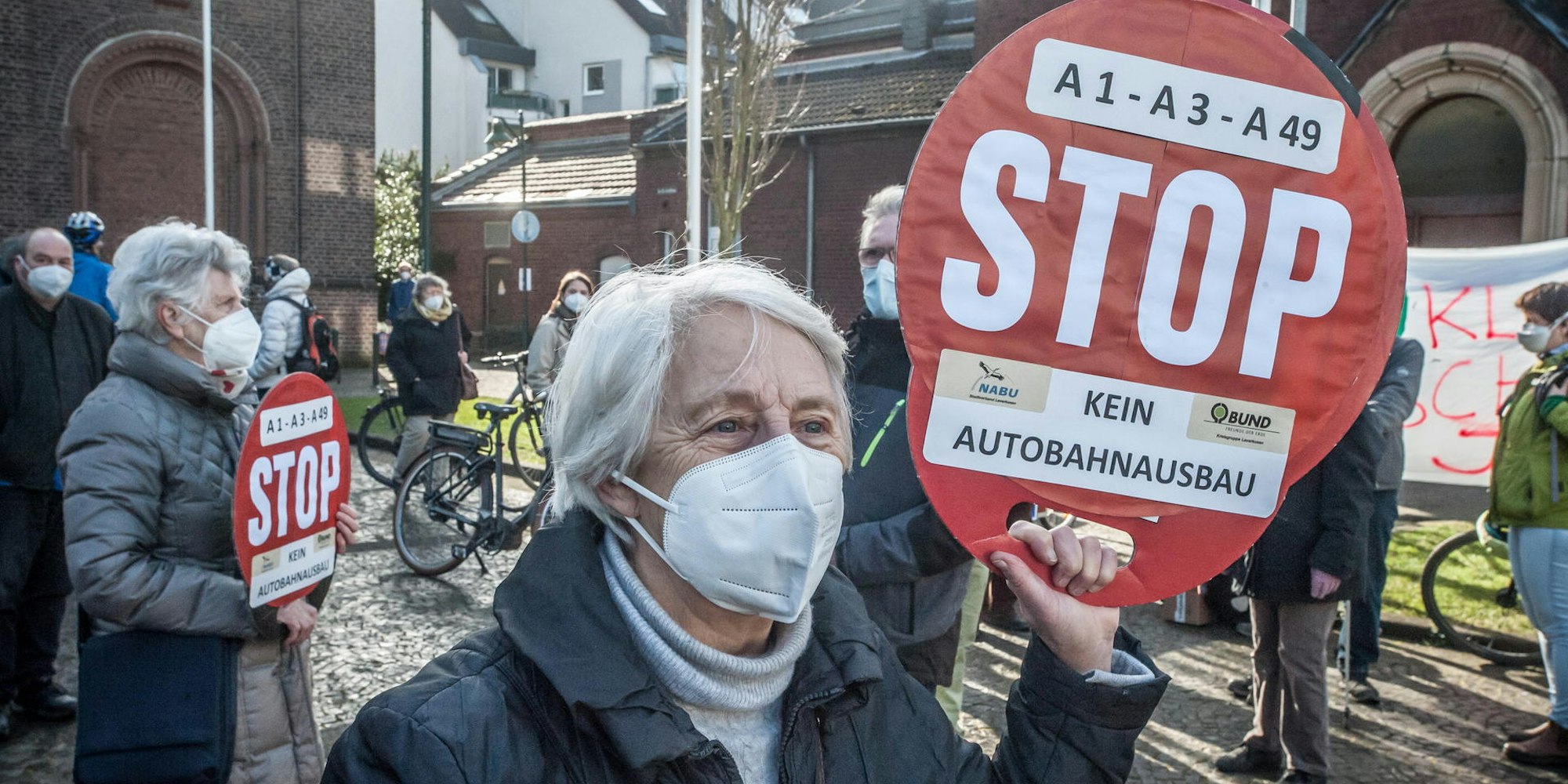 Und so haben an diesem sonnigen Tag viele Mitglieder der Leverkusener Organisationen „Adults 4 Future“ und „Christians 4 Future“ selbst gebastelte „Stop“-Schilder in der Hand. Auf ihnen steht „Stop! A1, A3: Kein Autobahnausbau“. Auch Ingrid Mayer hält ein solches Schild. Sie ist vom Naturschutzbund (NABU) und vom BUND, dem Bund für Umwelt und Naturschutz.