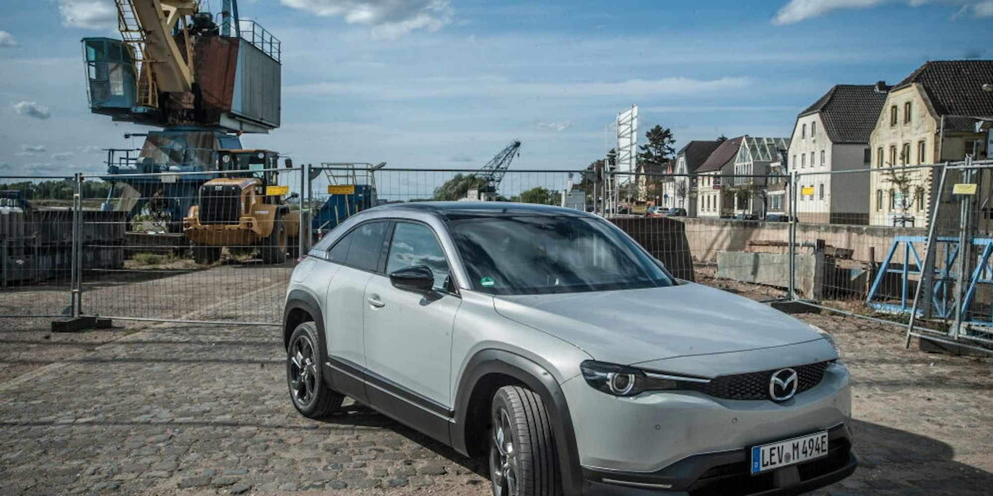Die Umgebung ist an der Hitdorfer Rheinfront nicht ganz so schick, aber die Teststrecke besser für Mazdas Elektroauto.