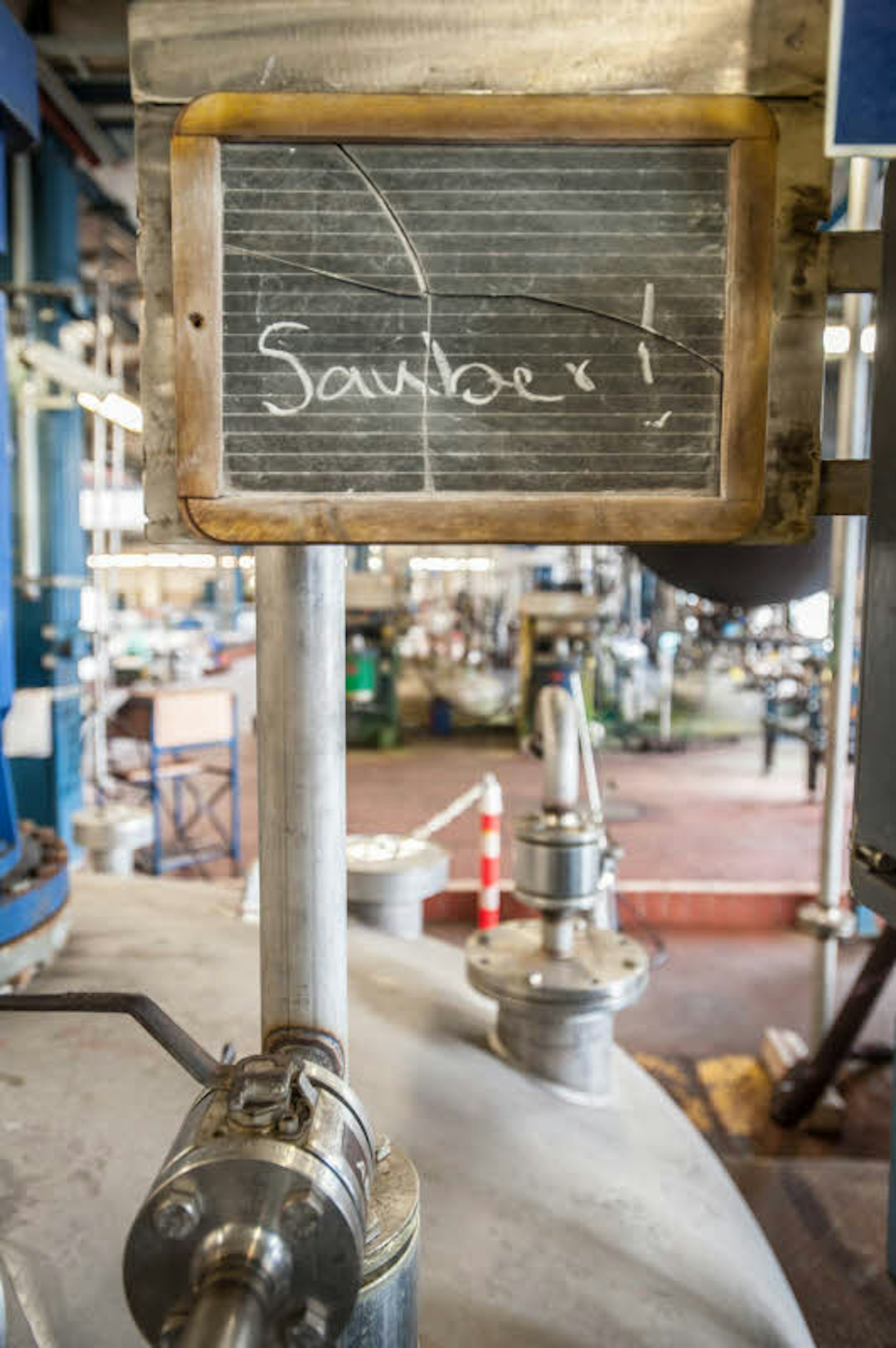 Im Betrieb fällt der Sprühtrockner sofort ins Auge. Nicht nur, weil er so zentral aufgestellt ist. Mit 25 Metern ist er auch höher als das Gebäude, wächst also über das Dach hinaus. In diesem Gebläse werden viele Farbstoffe behandelt. Das Verfahren, mit dem er gereinigt wird, ist ein Kapitel für sich. Genauso aufwendig werden die großen Töpfe behandelt, in denen die Stoffe angerührt werden. Auf einer Schiefertafel steht „sauber“. Das muss dann schon stimmen.