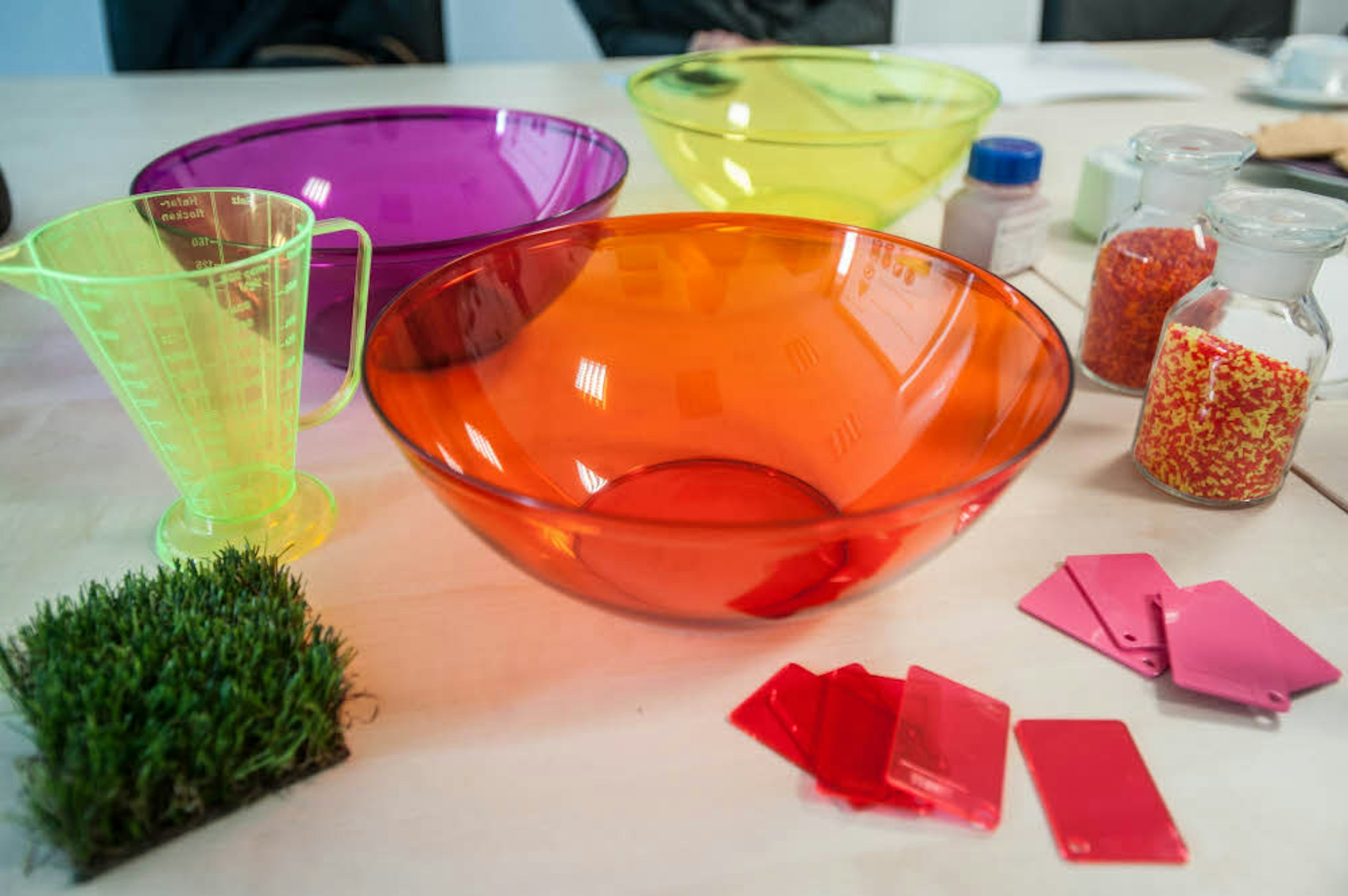 Trotzdem ist er froh, dass es im altehrwürdigen Farbstoffbetrieb nicht nur um die neuesten Handys geht. Auf dem Tisch stehen viele fröhlich bunte Küchenutensilien, dazwischen liegt ein Fetzen Kunstrasen – „ein Standardprodukt“, so Axel Lache. Wie die Pigmente für Druckerfarben. Auf dem Schrank fällt noch ein Raumschiff auf. Baustoff: Lego. Alles klar.
