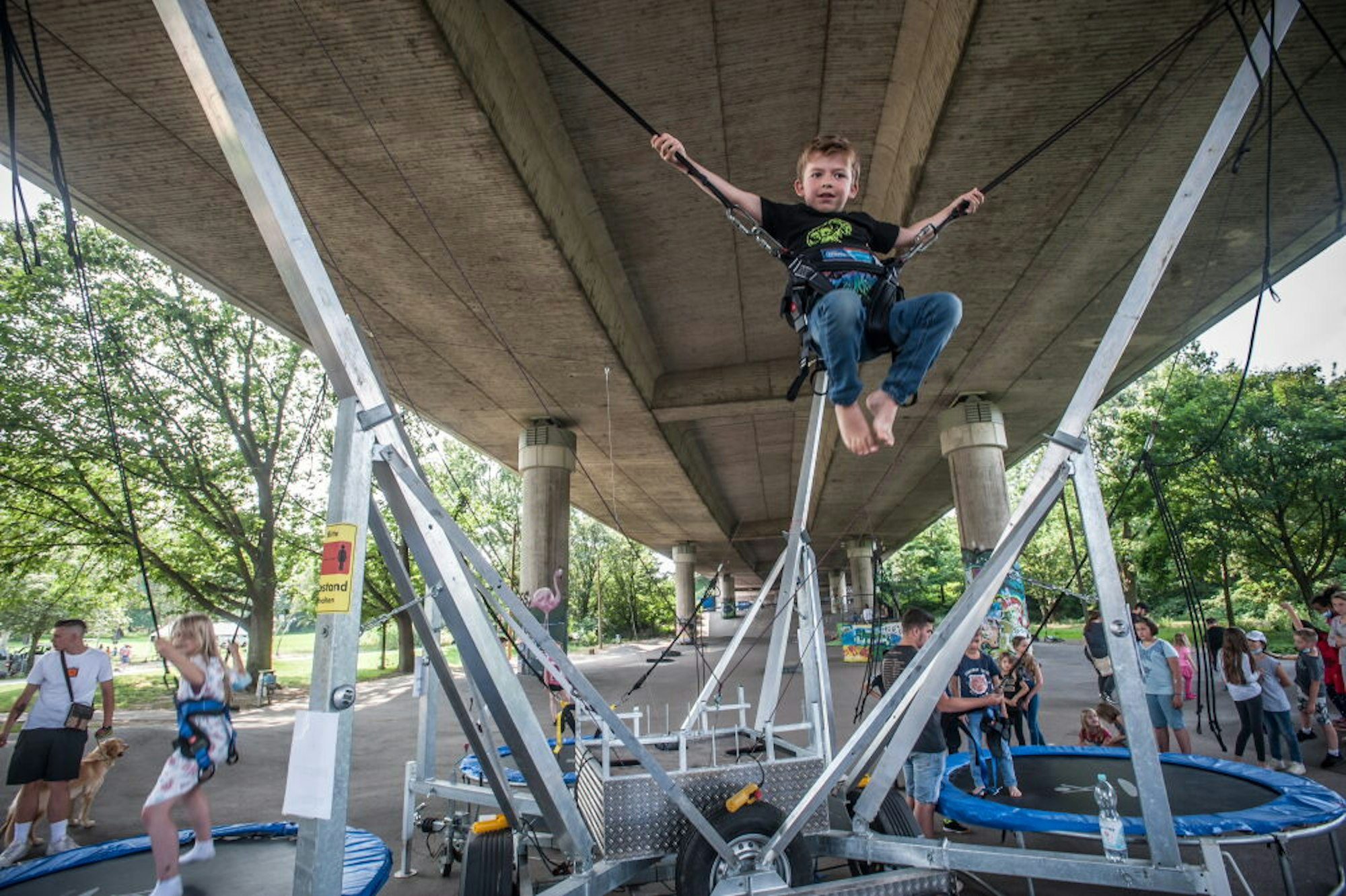 Bungee-Jumping auf Trampolins unter der Autobahn-Stelze.