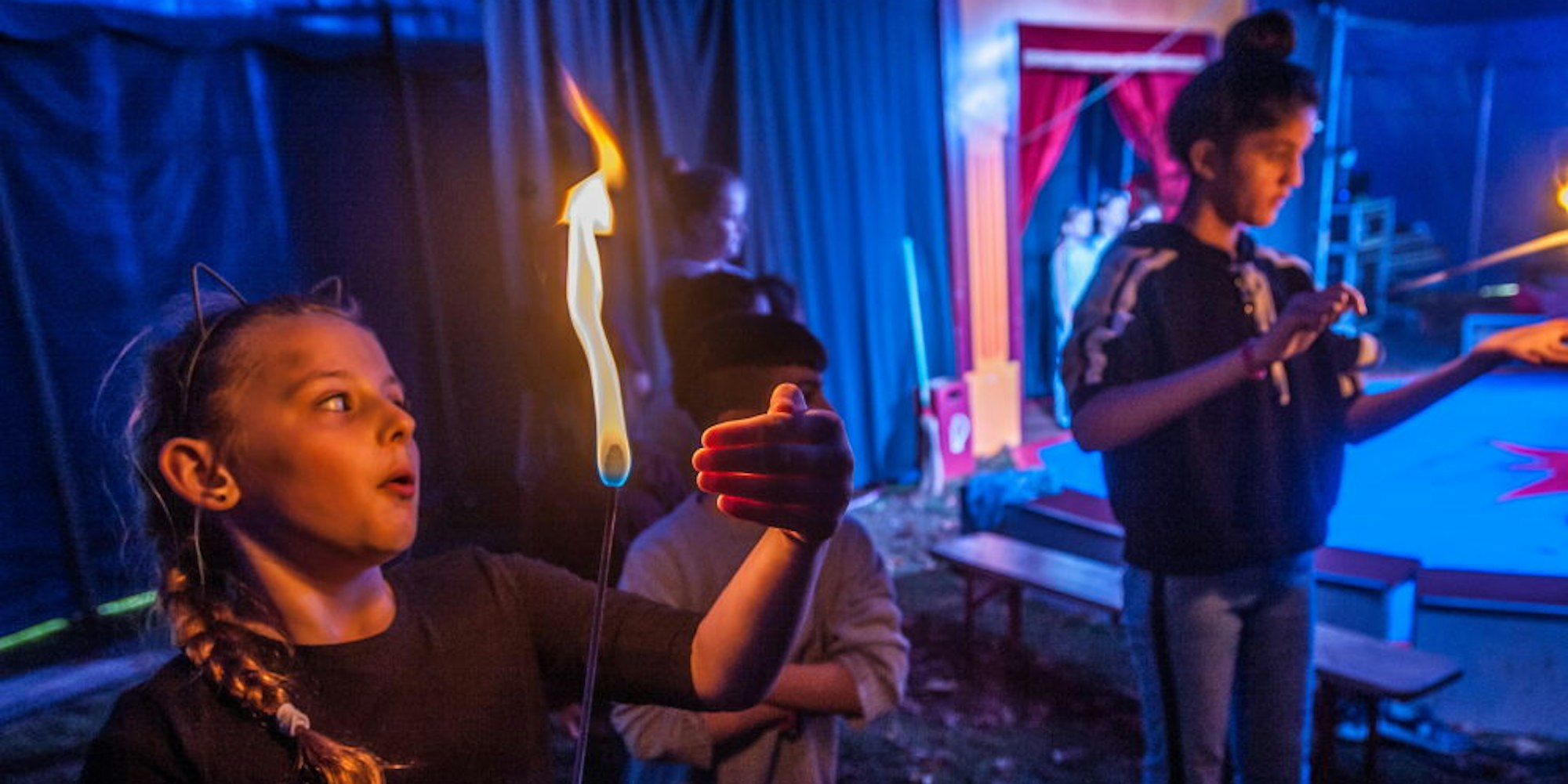„Wir haben alle Lampenfieber wegen der Aufführung“, geben die beiden Trapezturnerinnen Shadha und Doha zu. Draußen vor dem Zelt üben die Leiterakrobaten und Seiltänzer. „Ihr müsst immer geradeaus schauen, wenn ihr über das Seil geht“, erklärt Twin der Gruppe angehender Seiltänzer und reicht der ersten Mutigen seine Hand, damit sie mit seiner Hilfe über das Drahtseil schreiten kann. „Es freut mich immer zu sehen, wenn die Kinder glücklich am Ende des Tages nach Hause gehen“, sagt er.