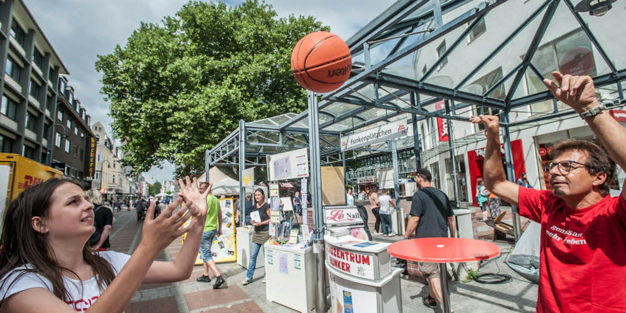 Aber irgendwie ist das auch kein Wunder, wenn man sich das Programm anschaut, das jetzt im Wiesdorfer Jugendtreff „Café Mittenmang“ vorgestellt wurde, während draußen, auf dem Rote-Funken-Platz, die teilnehmenden Jugendeinrichtungen ihre Arbeit vorstellten: Zahlreiche Workshops zu Themen, die Jugendliche ansprechen, werden angeboten. Allesamt werden sie geleitet von Profis. Da gibt es einen Skate-Workshop, einen für Graffiti und einen mit dem Titel „School Of Music“. Die Teilnehmer können T-Shirts im Siebdruckverfahren herstellen. Sie können sich der Airbrush-Arbeit widmen, das Schmieden lernen. Es gibt erstmals eine „Girl-Zone“, in der marokkanischer Tee ausgeschenkt und mit Henna-Farbe gemalt wird. Und nebenbei ist Bungee-Jumping ebenso möglich wie das Fußballspielen auf dem kleinen Feld im Fußballkäfig. Alles kostenlos dank der Hilfe von Sponsoren wie dem Lions Club, der Bürgerstiftung Leverkusen oder dem einen oder anderen Kreditinstitut.
