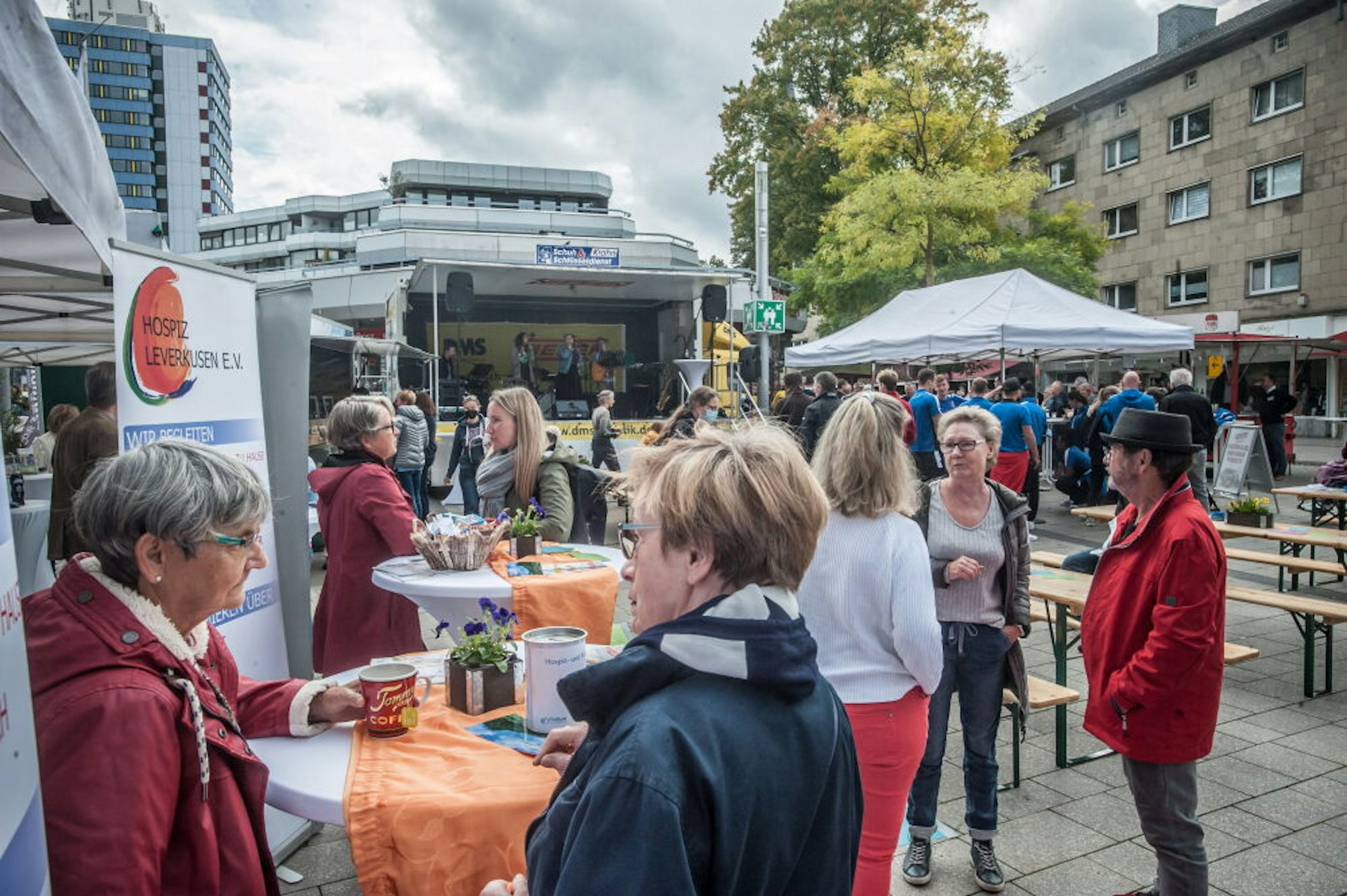 Leverkusen – Ein entspannter Einkaufsbummel durch die Wiesdorfer Innenstadt, vielleicht ein Eis mit ihrer Tochter, so hatte sich Claudia Brugger ihren Samstag vorgestellt. „Da ist ein Fest!“, ruft die siebenjährige Mirel, als sie die Zelte und Stände auf dem Rathausvorplatz sieht – ist man ja auch nicht mehr gewohnt in den kargen Coronazeiten. „Wir sind einfach hingegangen“, erzählt die Mutter und gesteht: „Als ich dann die Schilder gesehen habe mit Hospiz und Palliativstation, da bin ich ein bisschen erschrocken.“ Mit Tod und Sterben konfrontiert zu werden – das war eigentlich nicht ihr Plan für diesen Samstag.