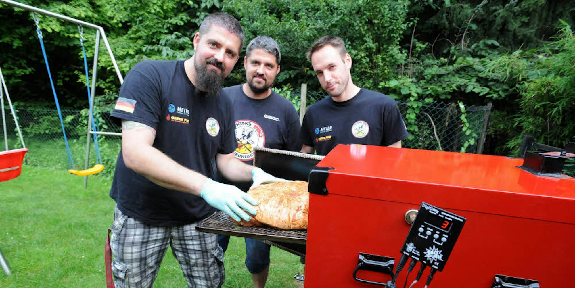 Daniel Räder, Thomas Räder und Markus Bondorf (v. l.) mit Schweineschulter und Helga, dem Smoker.