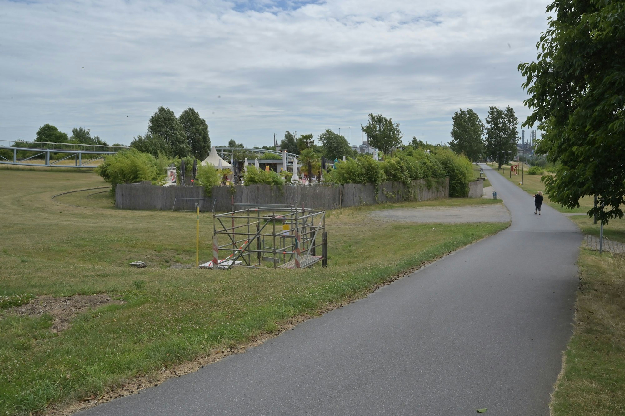 Hinter der Strandbar könnte ein öffentlicher Grillplatz entstehen. Der Rhein ist zwar nicht zu sehen, aber Pylone der Autobahnbrücke. 2005 stand hier eine Bühne, was noch am Boden zu erkennen ist. Der Zaun links gehört zur Strandbar.