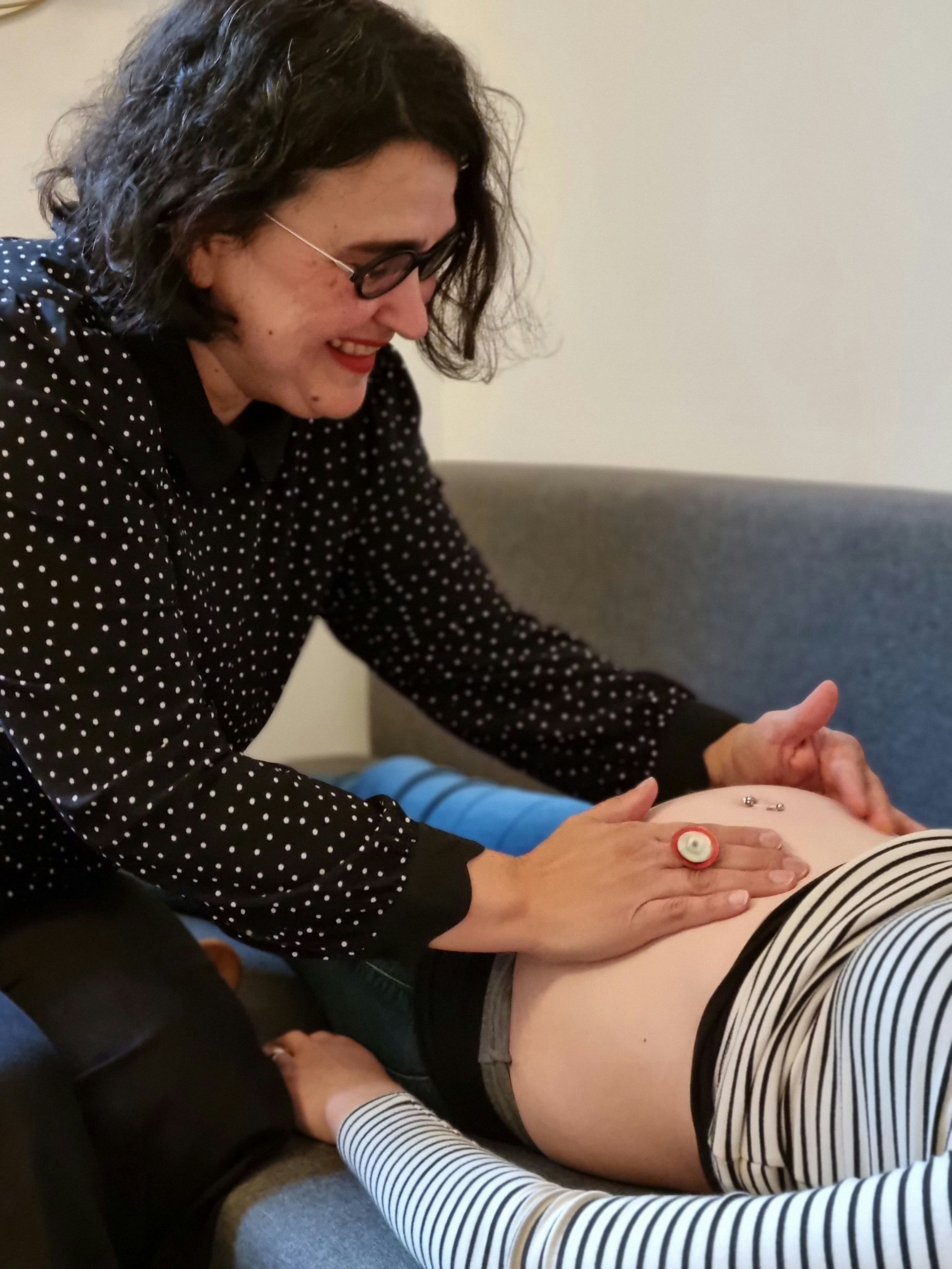 Emine Bodenstein untersucht den Bauch einer Schwangeren. Viel Zeit kann sie nicht für die ersten Wochenbettbesuche abrechnen.