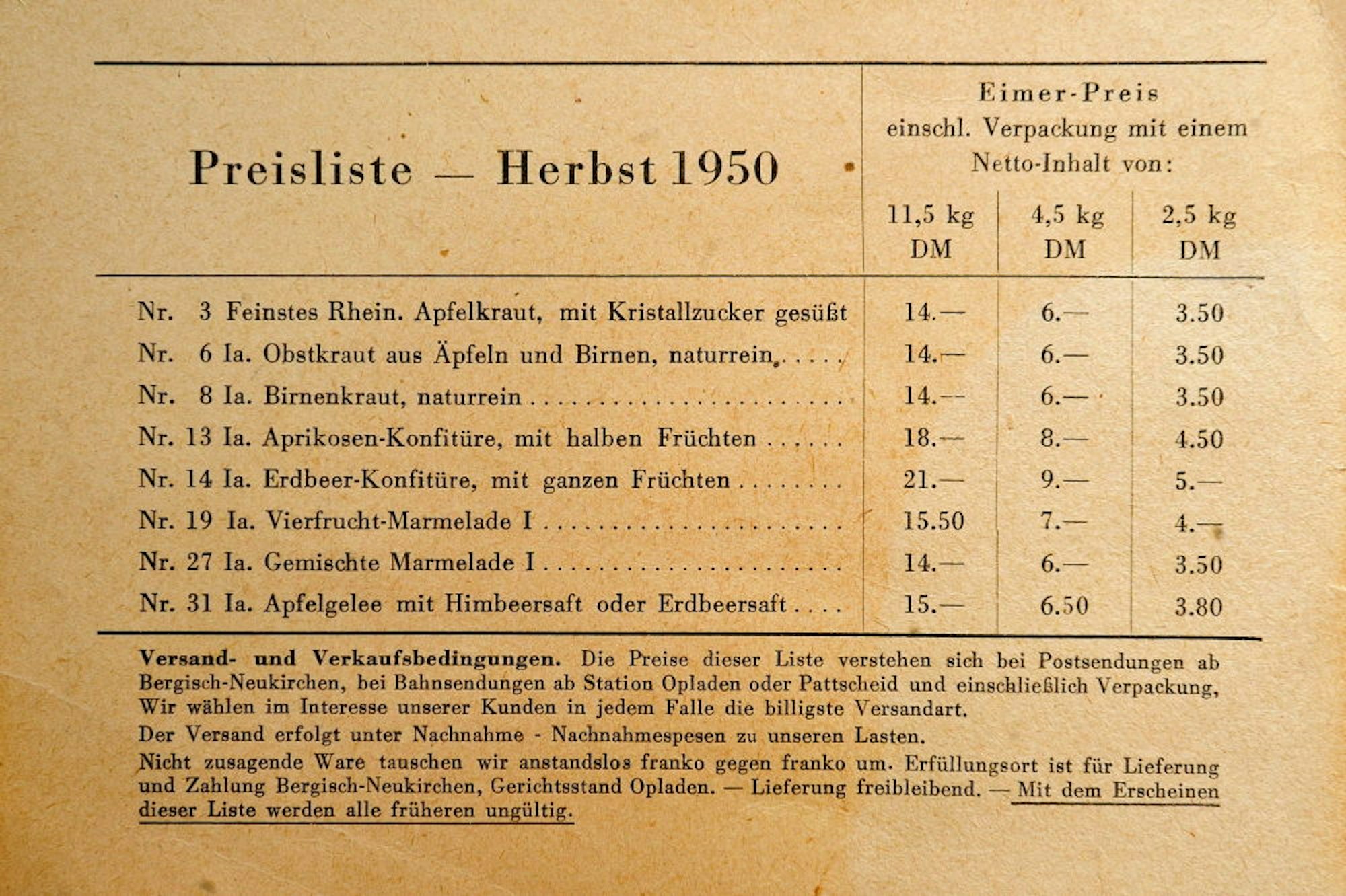 Eine Original-Preisliste von 1950: Konfitüre, Apfelkraut, Apfelgelee im Eimer. Man merkt: In Bergisch Neukirchen dreht sich alles um Obst.