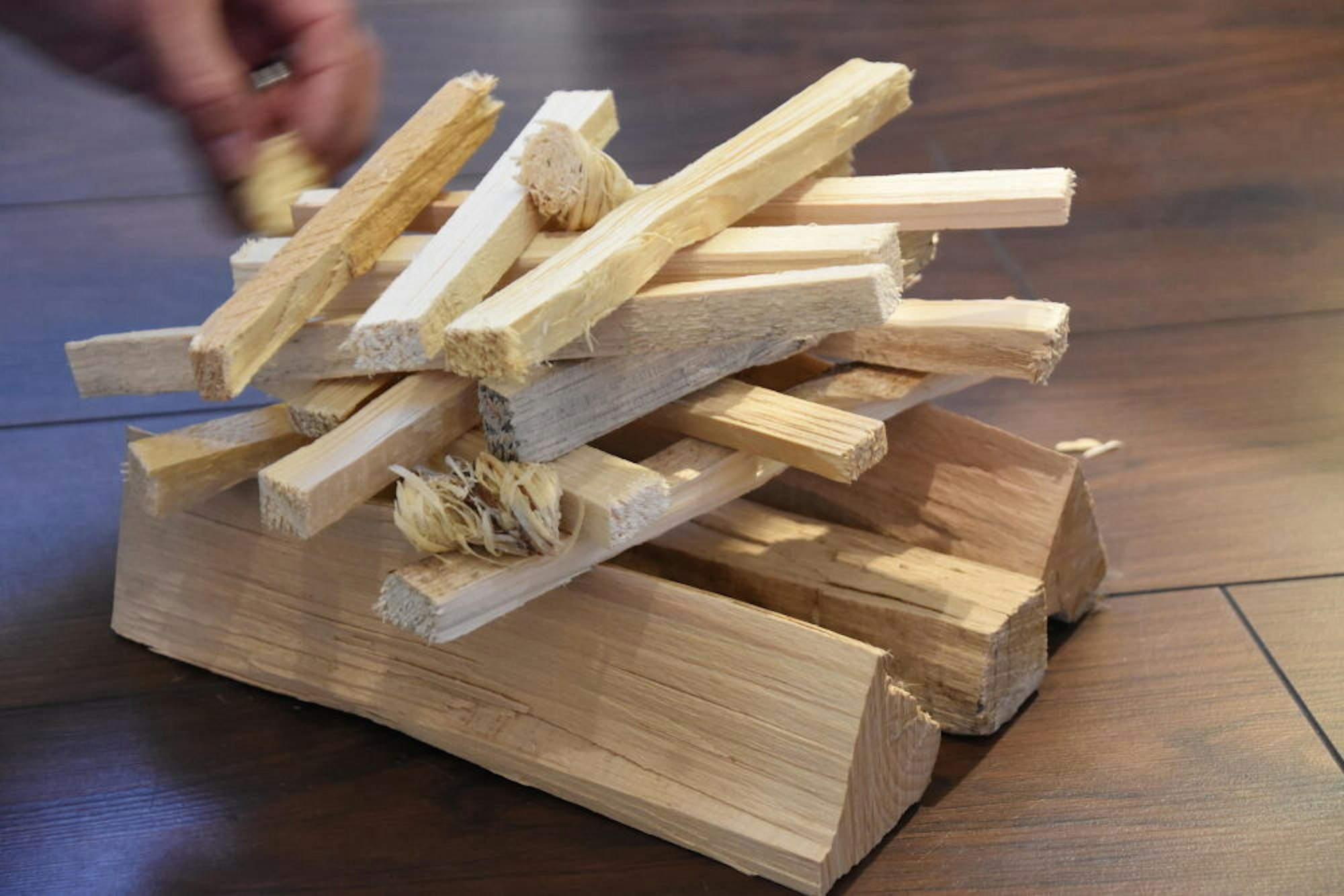 Dass dies Umweltverschmutzung ist, räumt Krings durchaus ein, zeigt aber, wie es richtig geht: „Wirklich gut gelagertes, ausgetrocknetes Holz verwenden, das ist wichtig. Und zum Anheizen braucht man ein solches Zündmodul“, zeigt er auf einen Holzstapel, in dem kleinere Hölzer und ein paar Späne sorgsam über dem armdicken Brennholz darunter liegen.